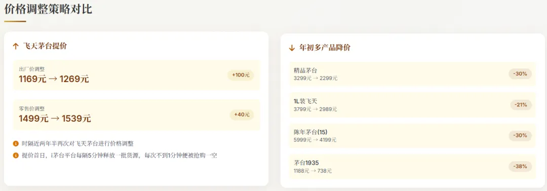 - 价格调整:飞天茅台出厂价与零售价上调,而年初精品、茅台1935等多款产品降价,形成价格组合拳。