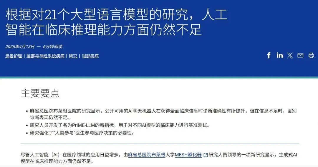 这项研究测试了Cha tGPT、Gemini、DeepSeek等21款主流通用大模型,深入剖析了它们在临床推理过程中的表现。作为一名教学者,我读罢全文,最深的感触反而是对人类临床推理起始环节价值的再确认。