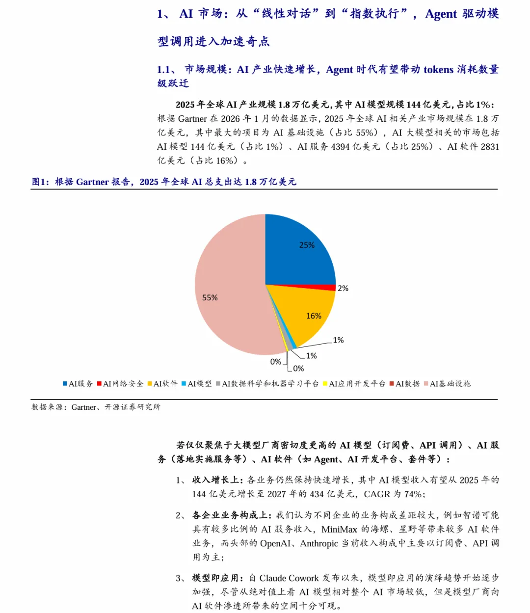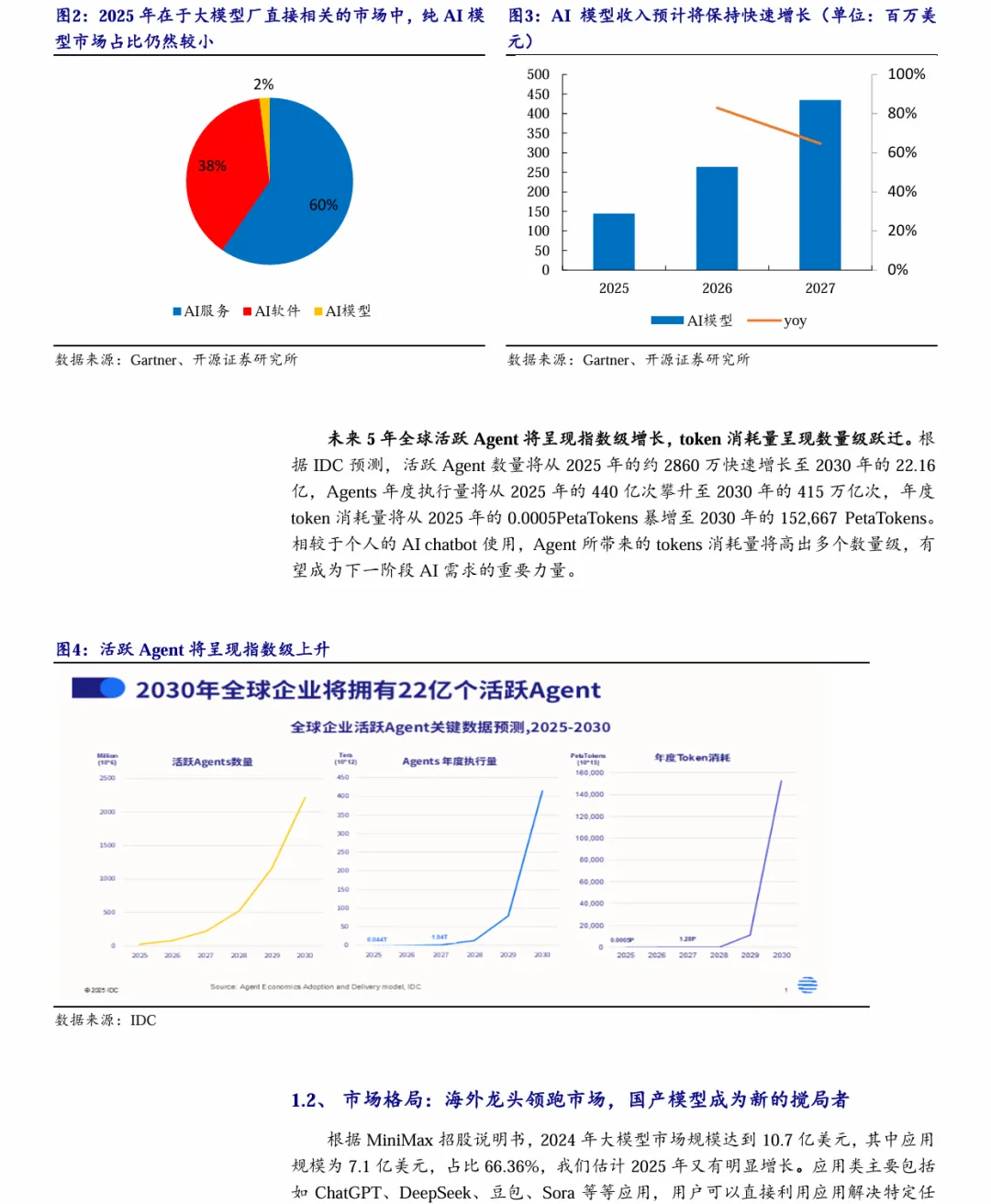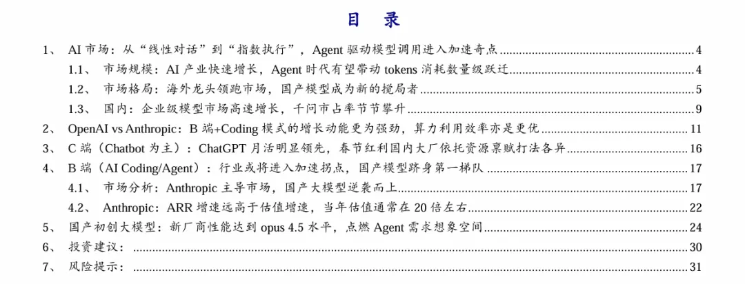 摘要:Agent驱动AI模型调用进入加速拐点,全球活跃Agent数量将从2025年2860万增至2030年22.16亿,Token消耗呈指数级增长。2025年全球AI产业规模达1.8万亿美元,AI模型市场CAGR达74%。OpenAI与Anthropic领跑,国产大模型凭借开源、成本与性能优势跻身第一梯队,MiniMax、千问、智谱等表现突出。行业从“大而全”转向“精而准”,B端与C端同步爆发。投资聚焦模型端(阿里、百度、MiniMax、智谱)、AIInfra(第四范式、百融云)、算力端(金山云、万国数据)。