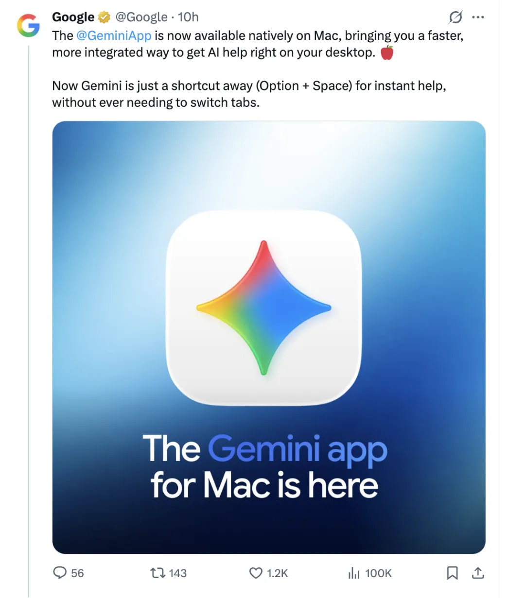 Google今天上线了Gemini的Mac App。GPT和Claude都有了之后,可能Google也耐不住寂寞,准备跟上。