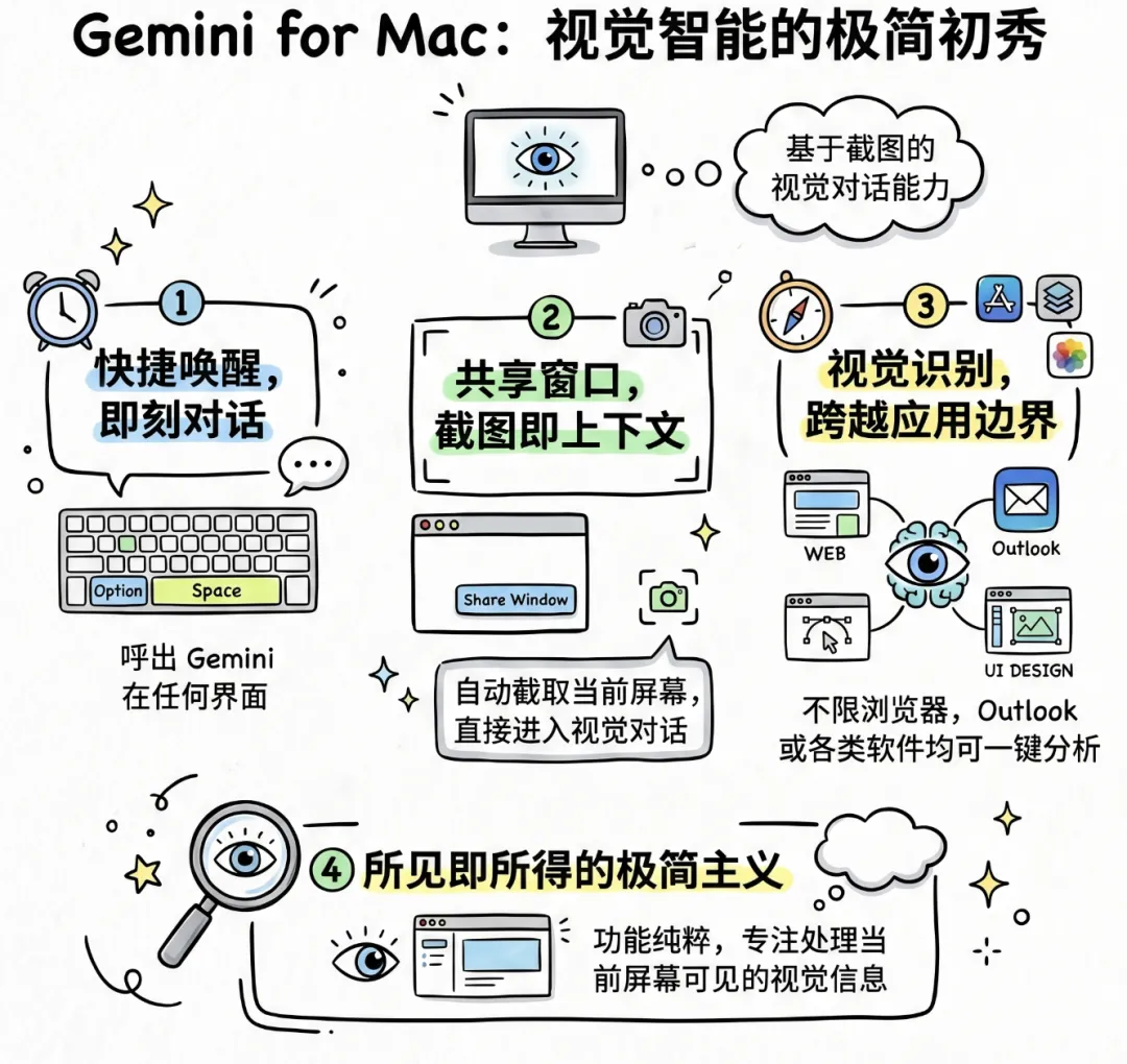 相比文字抓取,它的好处是:不局限于浏览器内容,Outlook、其他应用也都可以,能截图就能聊,一键添加。你可以问网页内容,也可以问一些其他需要通过视觉确认的问题,比如UI、设计、图片风格,不必经过复杂的App连接。