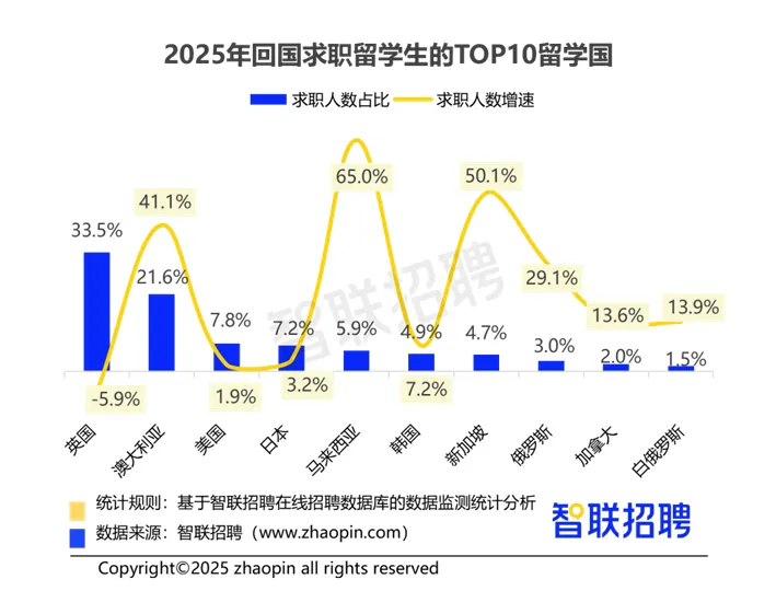 2025年回国求职的海归人数同比增长5%,来自新加坡、马来西亚这些东南亚国家的海归求职人数,增速高达50.1%-65%,远超英美等传统热门留学地。