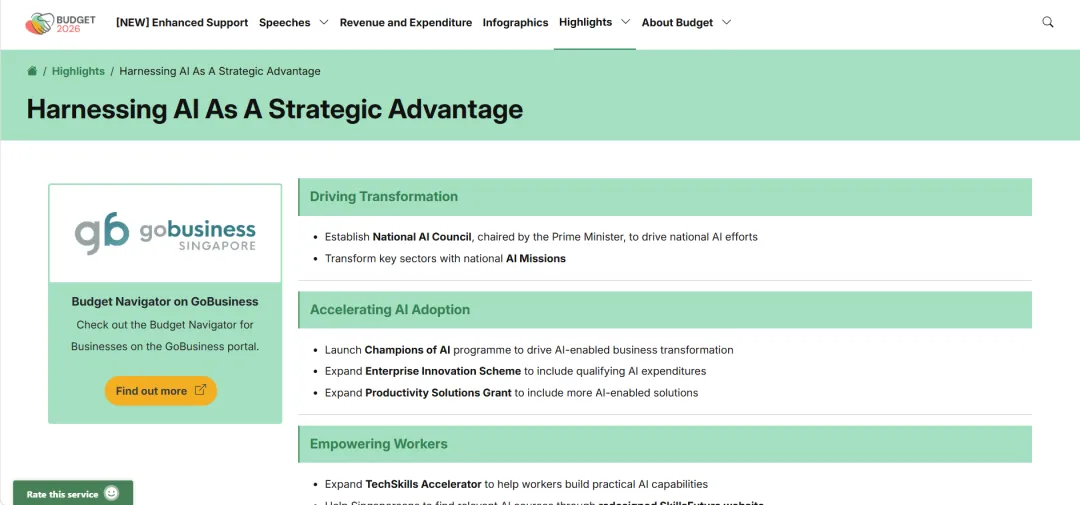 2026年,进一步将 AI 上升为国家战略核心,同时,重点打造新加坡的“亚洲硅谷”——纬壹科技城AI产业园区,以期成为全球AI创新枢纽,(目前该园区已吸引跨国科技巨头Grab、雷蛇等知名企业入驻);