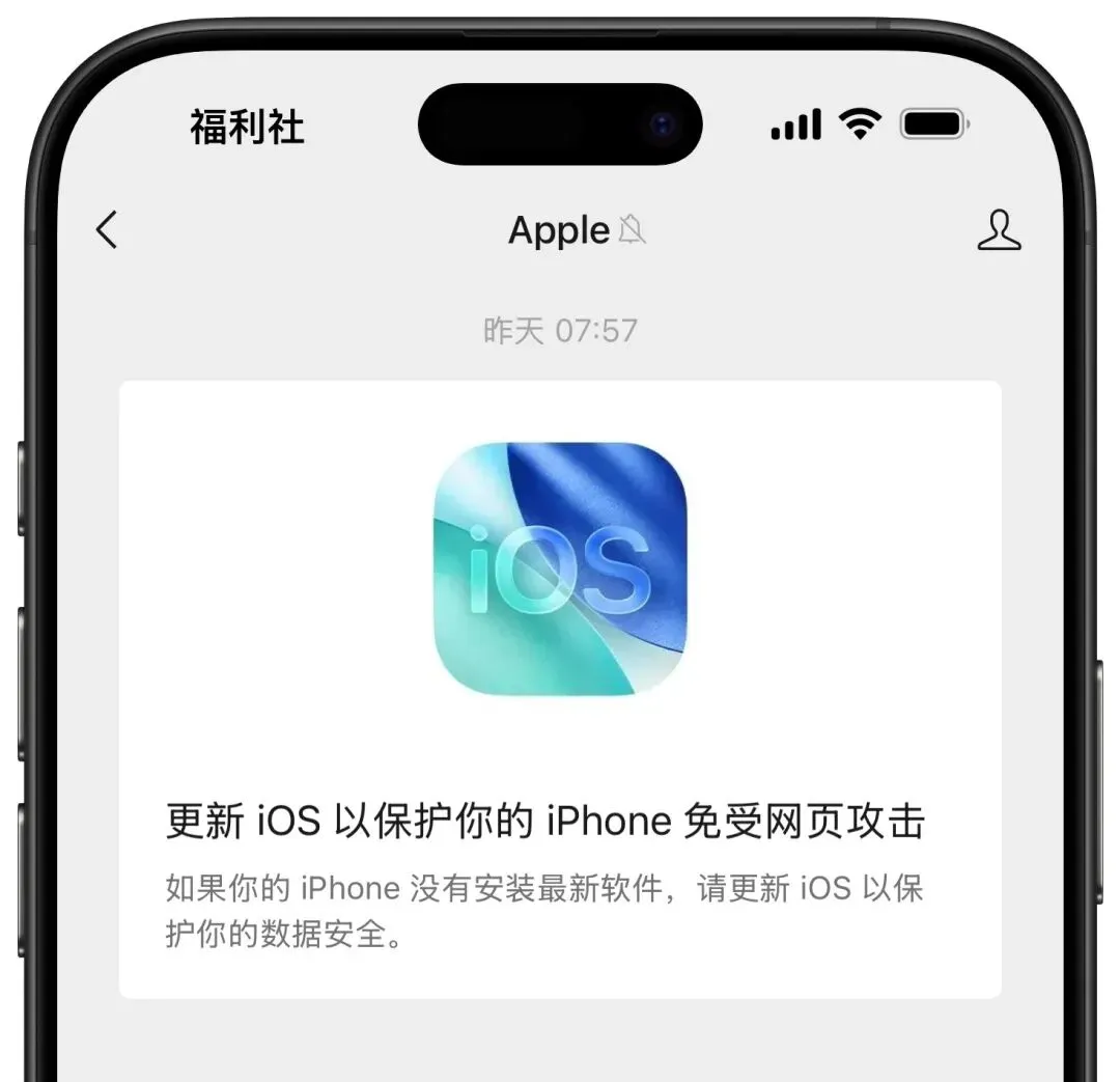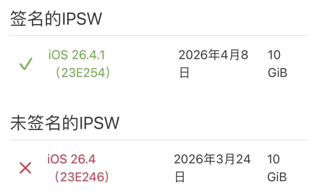 Apple发文:再次紧急提醒 / iOS 26.4 验证已关闭苹果官方微信公众号发文提醒,标题为:更新 iOS 以保护你的 iPhone 免受网页攻击。再一次提醒苹果用户尽快更新至iOS最新系统,保护自己的数据安全。苹果还破天荒的给所有用户开放了 iOS 18.7.7 的OTA升级通道,可见漏洞的严重性!在这之前,苹果官网以及工信部都发文提醒过iOS用户尽快升级,这两个恶意漏洞是 Coruna 和 DarkSword。苹果称,这两个漏洞已经补黑客正在积极的利用,你只要不小心点击一个恶意的网页,就能被窃取敏感信息。所以,一定不要点击陌生网址,和安装陌生APP。iOS 26.4关闭苹果今早也正式关闭了 iOS 26.4 系统的验证通道,也就是说再也不能降级回至此系统了。目前,只有 iOS 26.4.1 正常开放着。