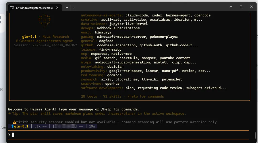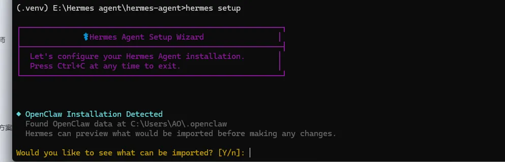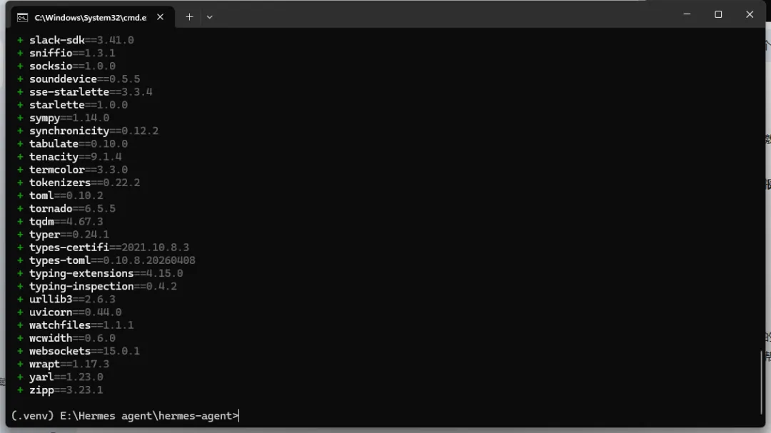 (.venv) 前缀。若没有,先执行 .venv\Scripts\activate。-i https://pypi.tuna.tsinghua.edu.cn/simple,或改用阿里云源 https://mirrors.aliyun.com/pypi/simple。D:\hermes-agent),重新进入目录激活环境即可。🚀 其他问题