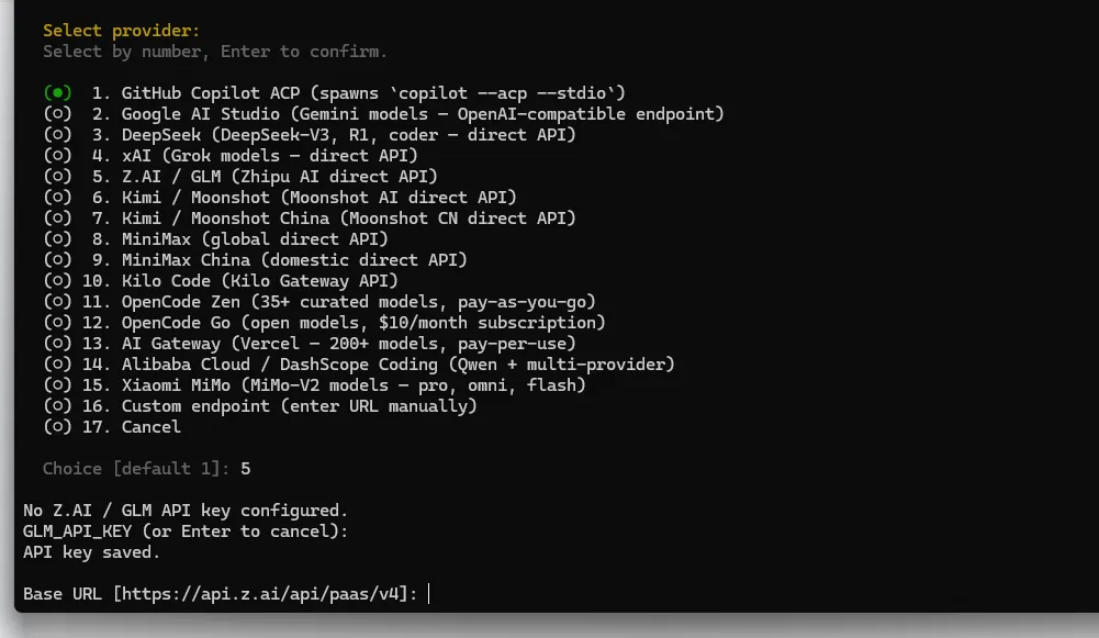 先输入 8(More providers...)回车翻页,然后输入 Z.AI / GLM 对应的序号(通常是 5)回车。