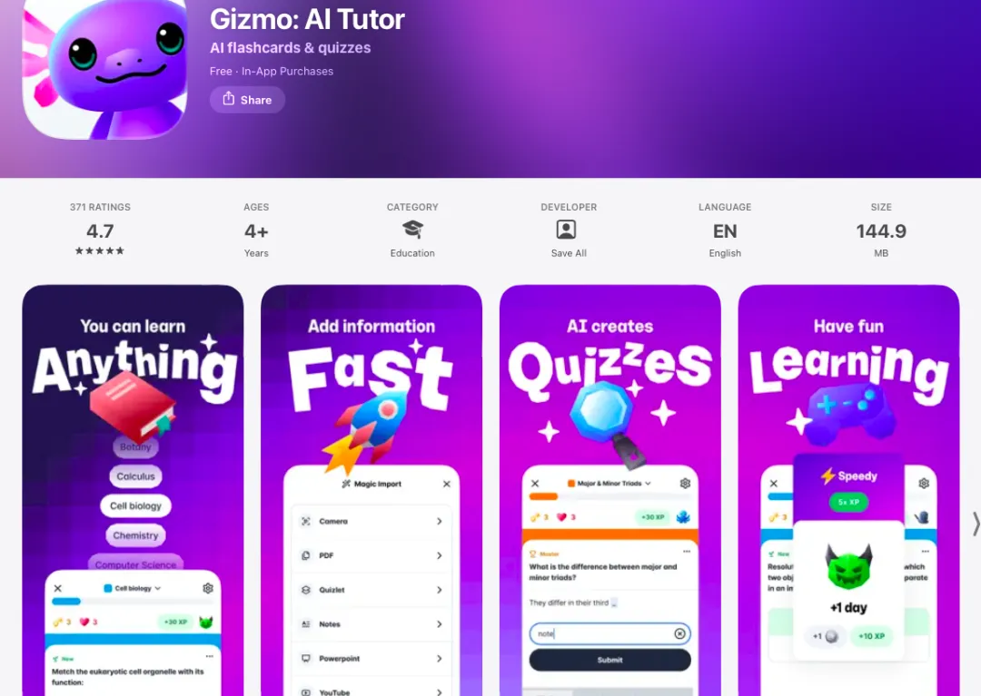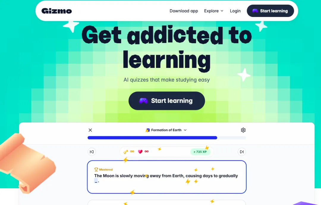 Gizmo核心特色在于使用游戏机制来推动学习,将被动的学习材料转化为一套主动学习系统——它能在几秒钟内将学生的笔记、文档、网页内容转化为个性化、游戏化的互动学习材料,包括互动抽认卡、自适应测验和游戏化挑战。此外,其还内置排行榜、连胜、挑战朋友等社交机制以扩大用户留存。