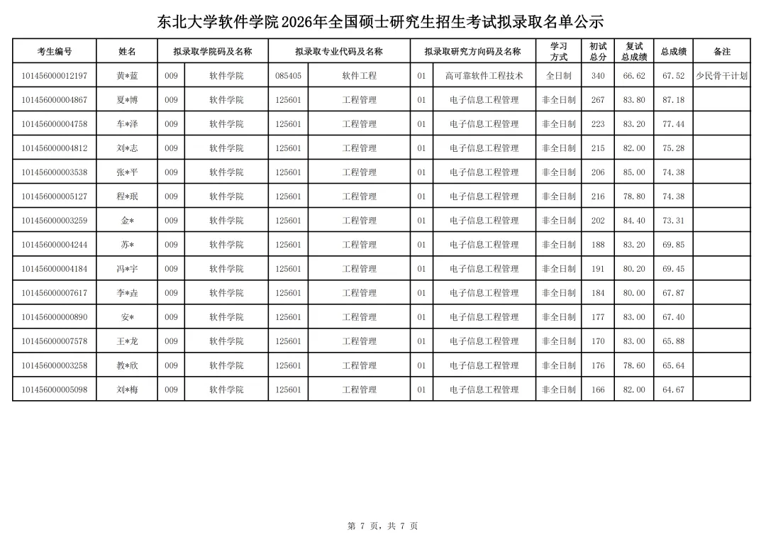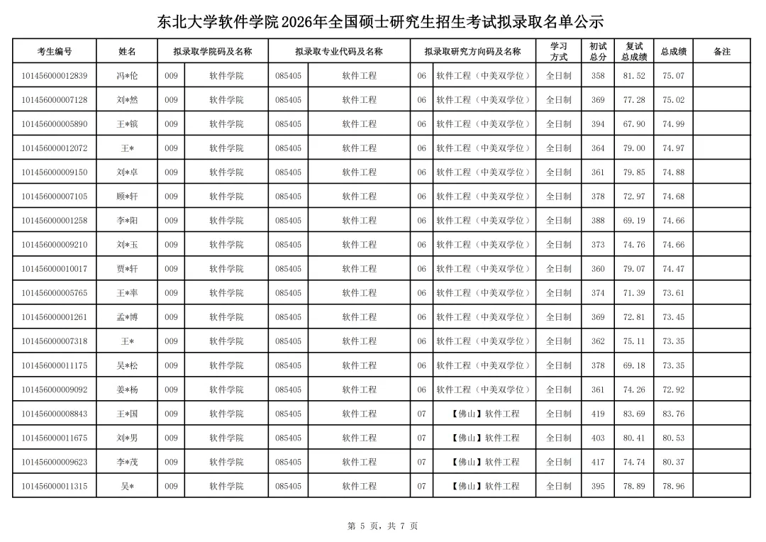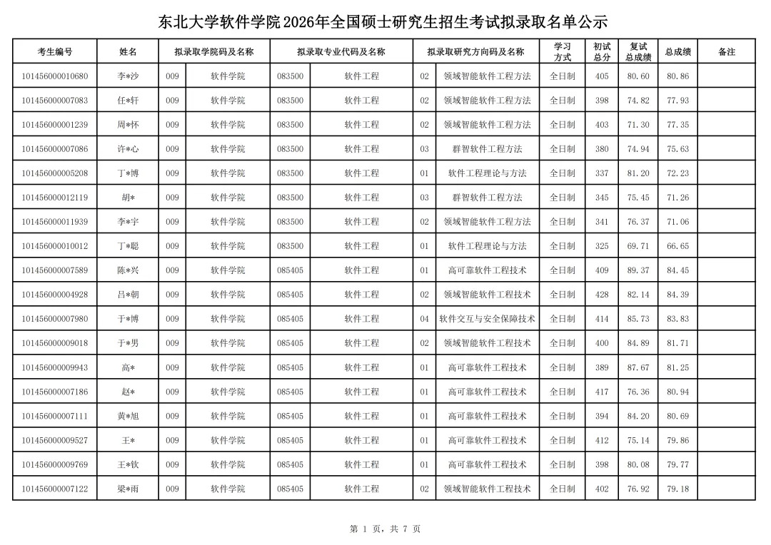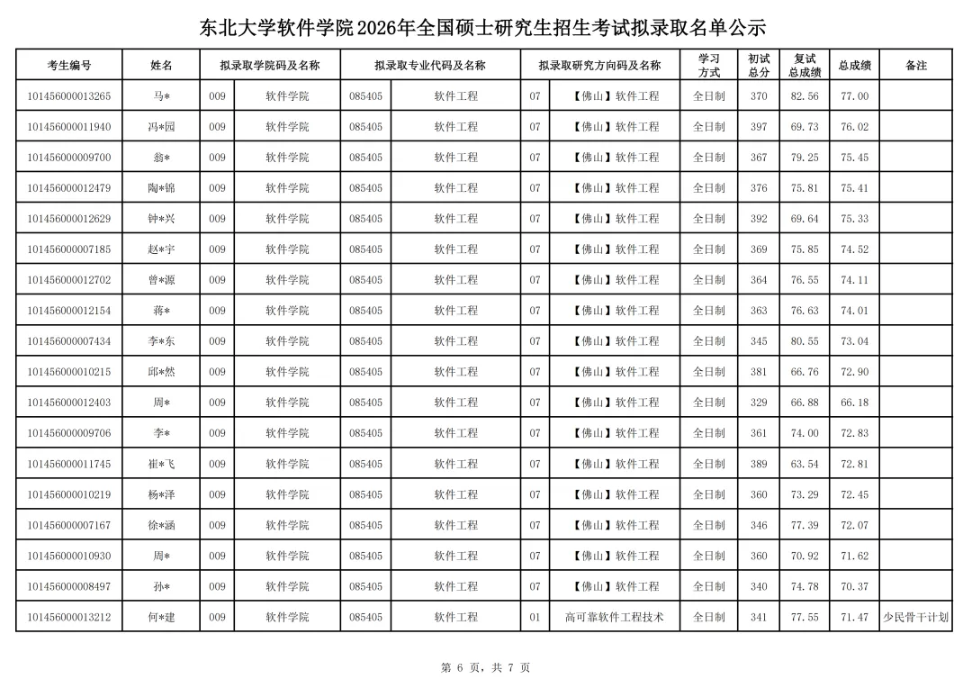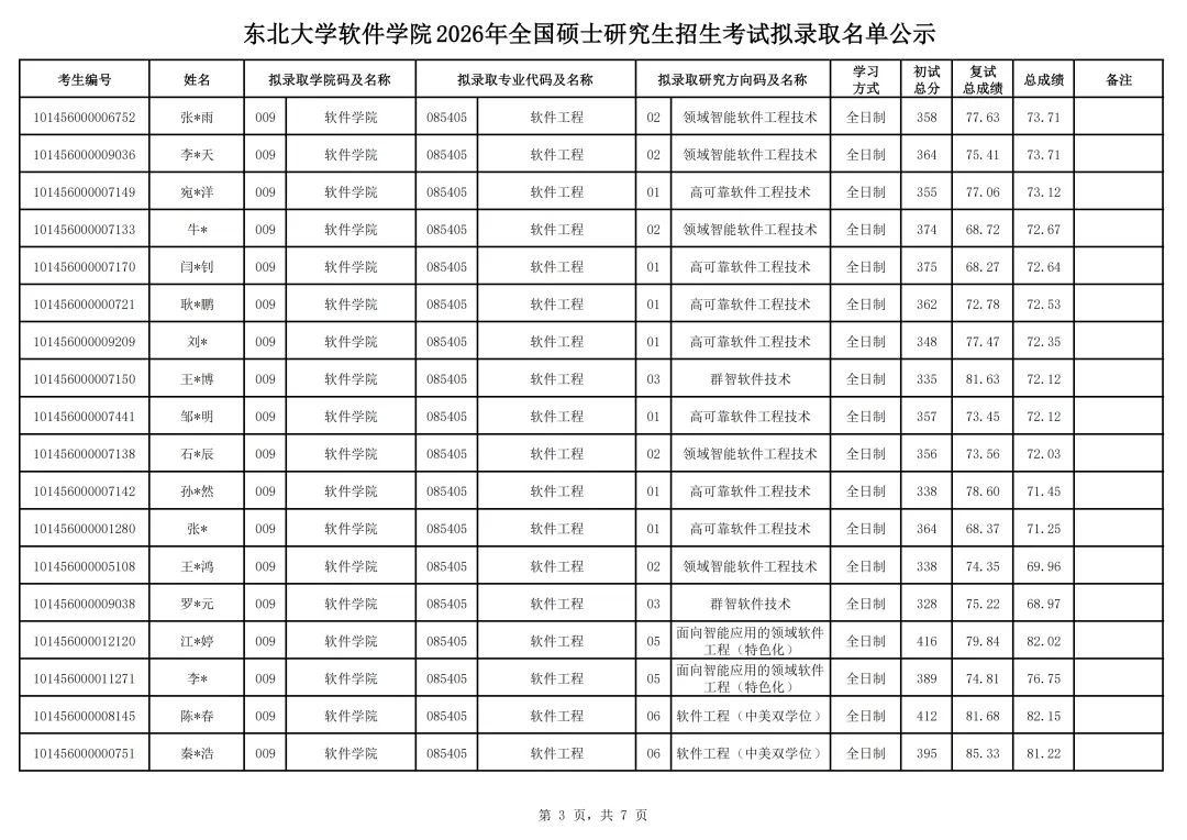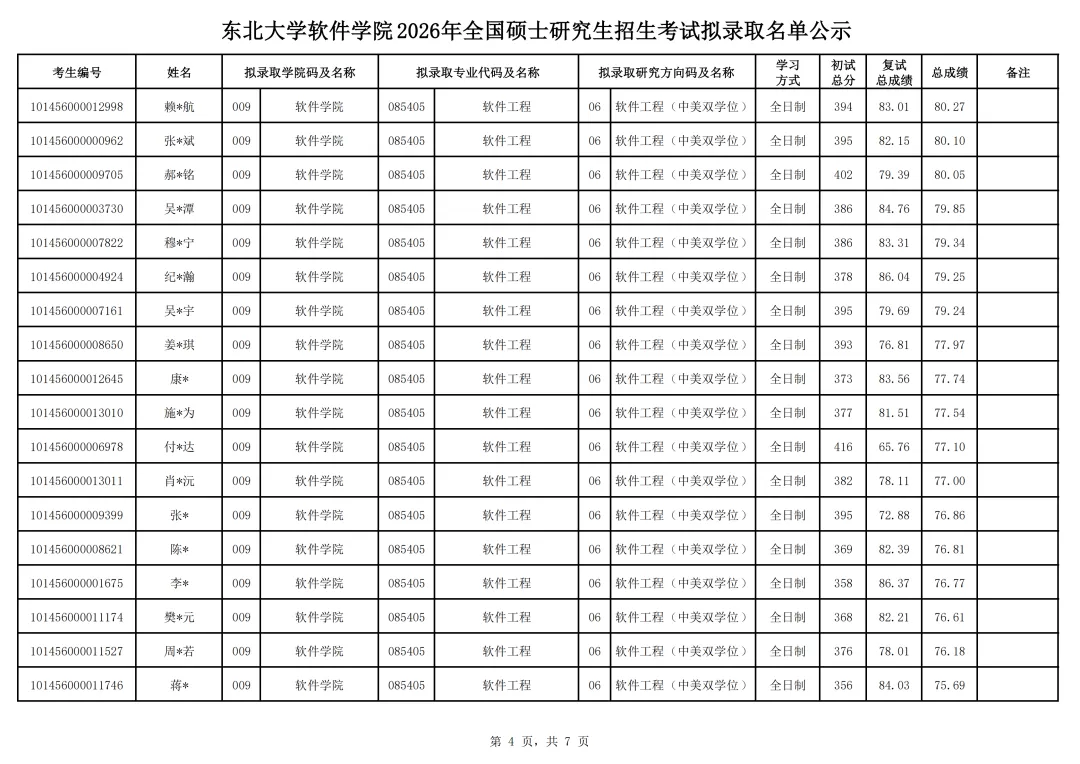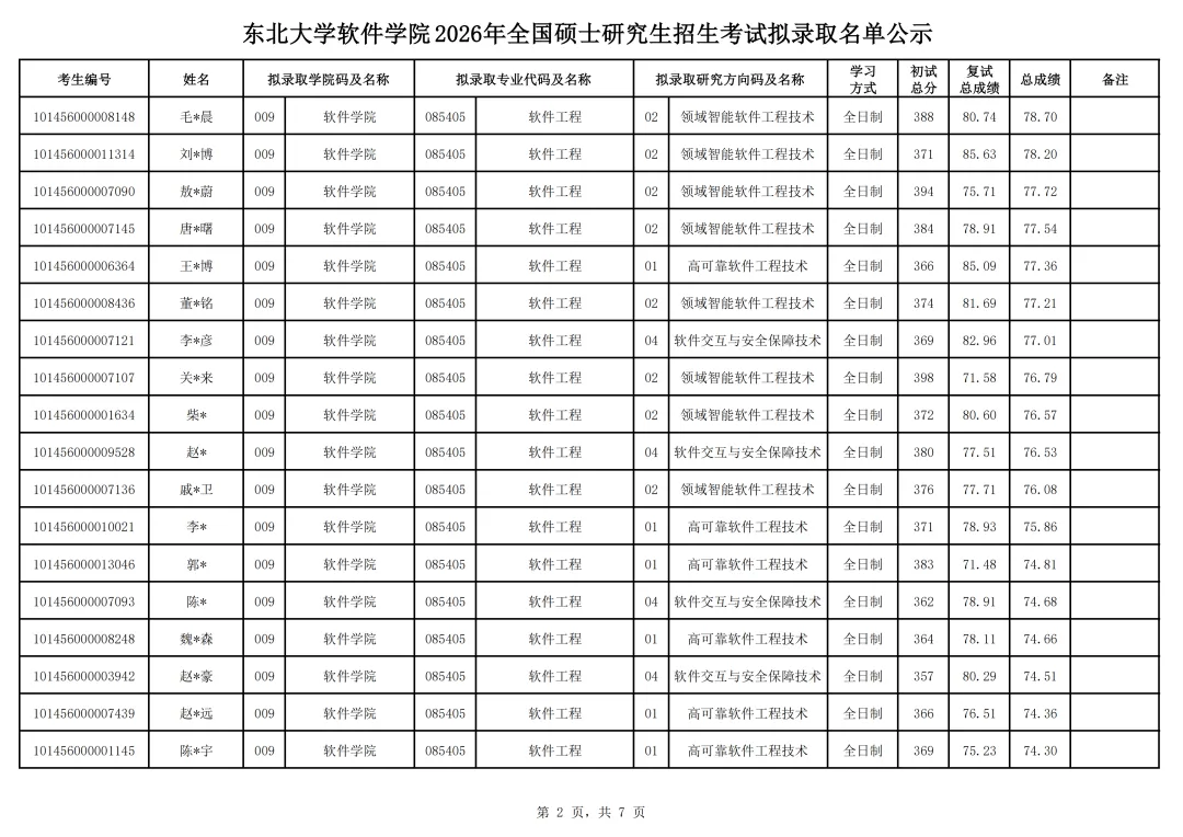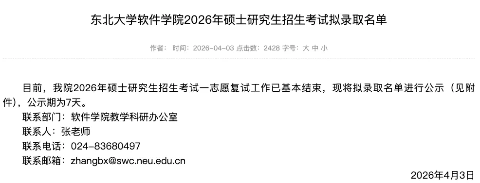 东北大学软件学院公示2026年硕士研究生招生考试拟录取名单声明:以下数据来源东北大学,如有侵权,请联系删除!2026年4月3日,东北大学软件学院在其官方网站上发布了"2026年硕士研究生招生考试拟录取名单"的通知,通知原文网址:http://sc.neu.edu.cn/2026/0403/c144a452002/page.htm2026年全国硕士研究生招生考试拟录取名单: