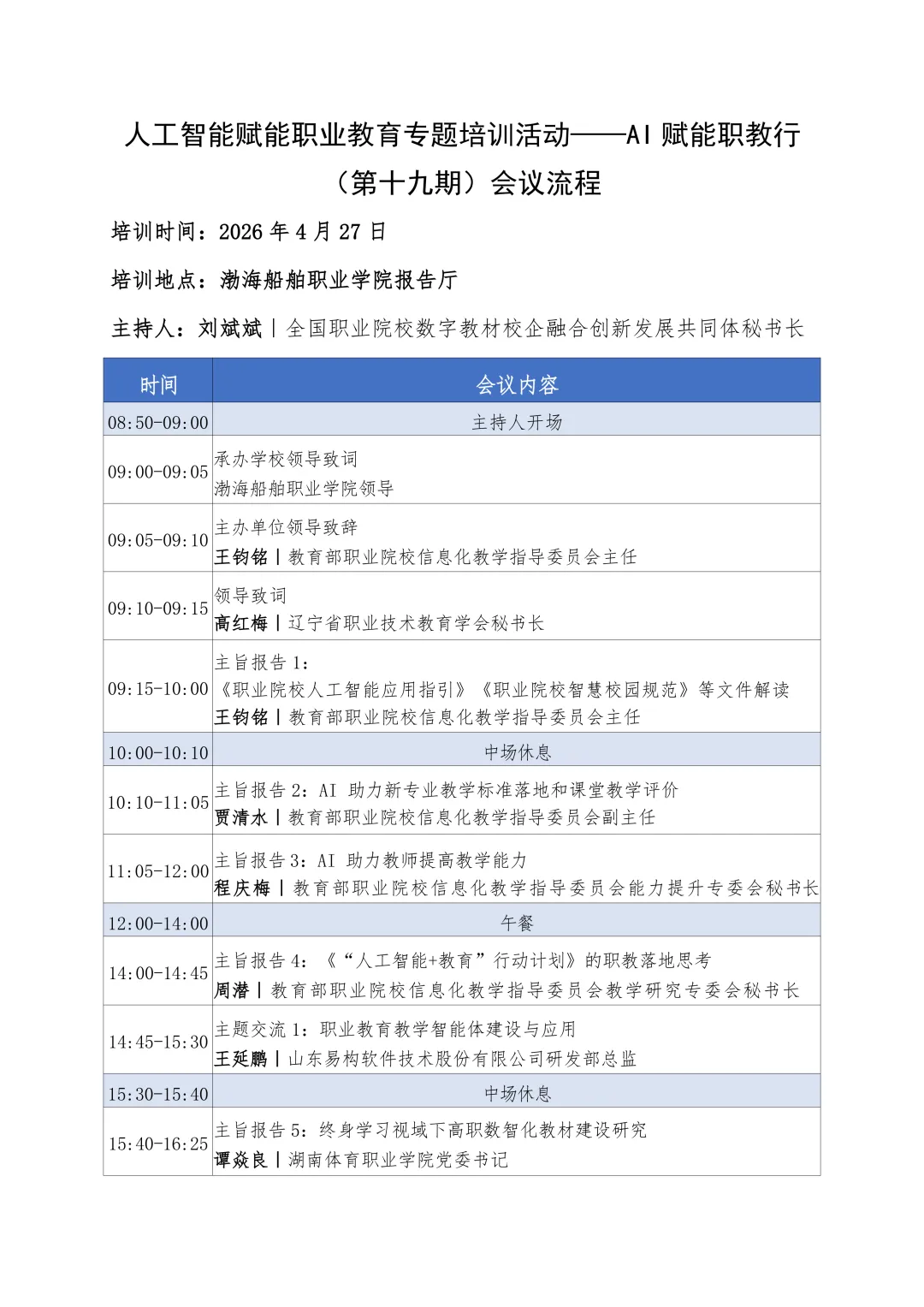 为落实《“人工智能 + 教育” 行动计划》等政策要求,推动人工智能赋能职业教育创新发展,AI 赋能职教行(第十九期)—— 人工智能赋能职业教育专题培训将于2026年 4 月 26 至 28日( 26 日下午报到,27 日全天培训,28 日离会)在辽宁葫芦岛・渤海船舶职业学院举办。