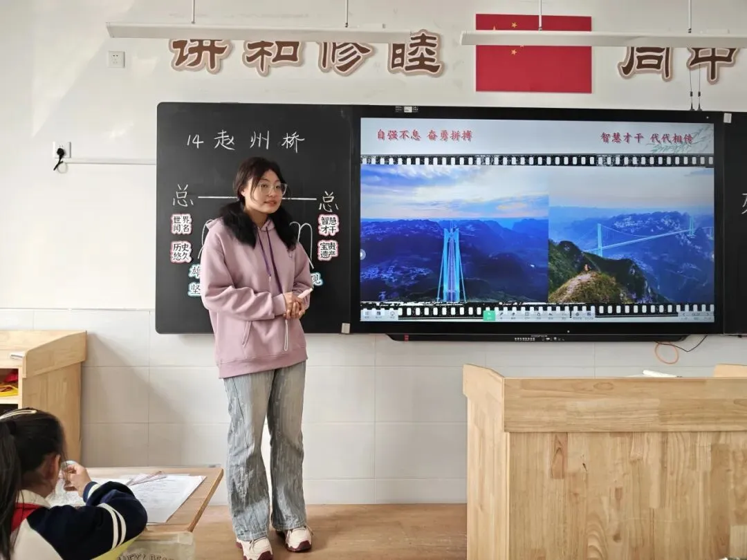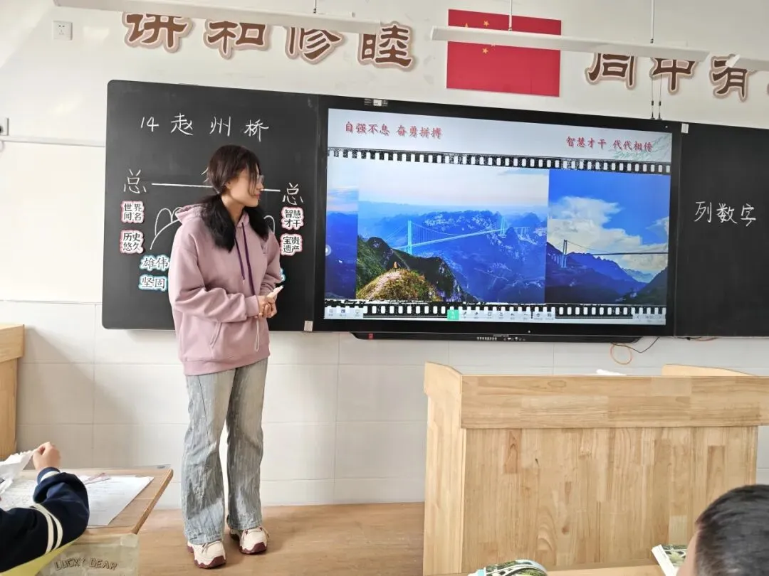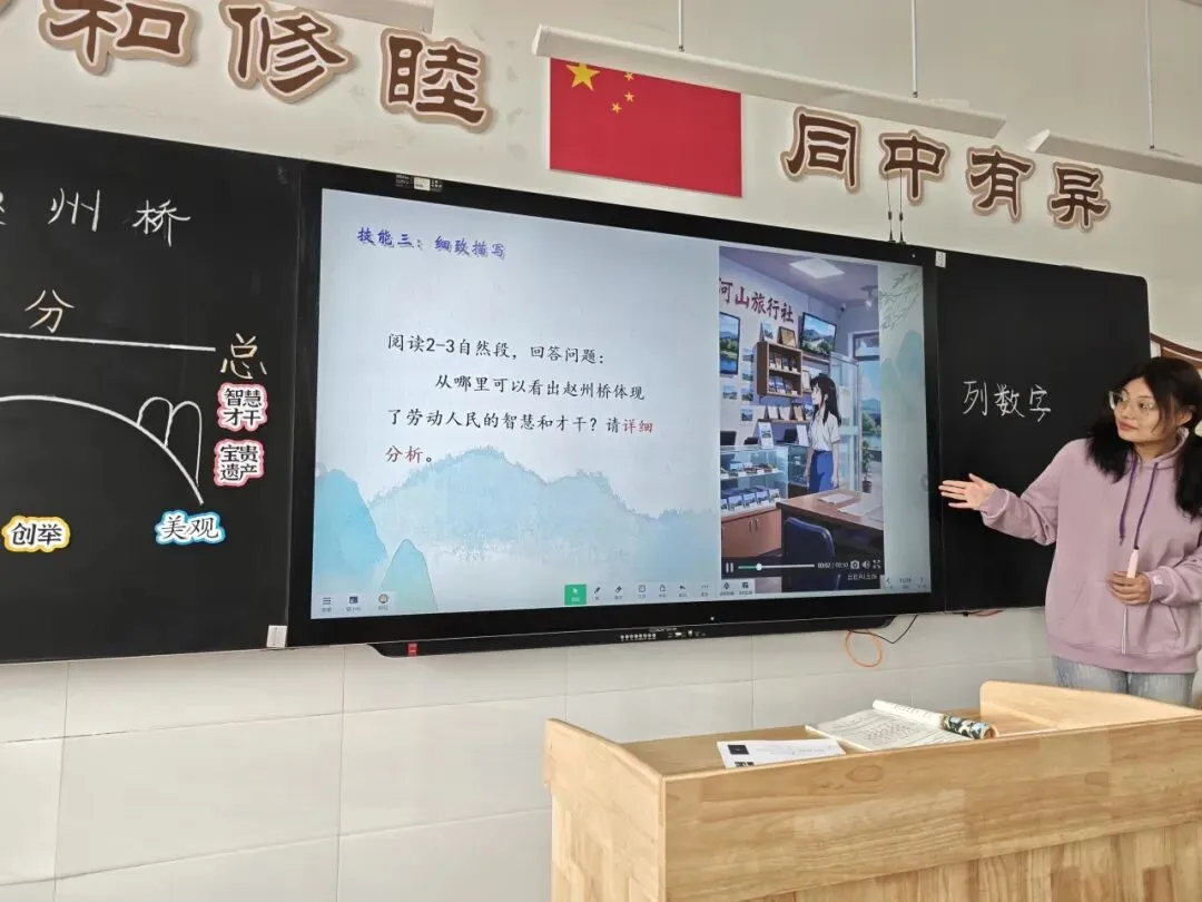本课以赵州桥为核心打造趣味情景课堂,紧扣小导游四大必备技能设计环环相扣的教学环节,层层推进引导学生沉浸式学习。课堂中特设AI互动环节,AI和同学们实时互动,助力拆解各技能要点、梳理讲解思路,课程最后升华至感受古代工匠智慧、传承家乡文化的主题。在AI赋能与实践体验中,既提升了学生的语言表达与综合运用能力,又厚植了文化自信,实现了语文素养与家国情怀的同步提升。