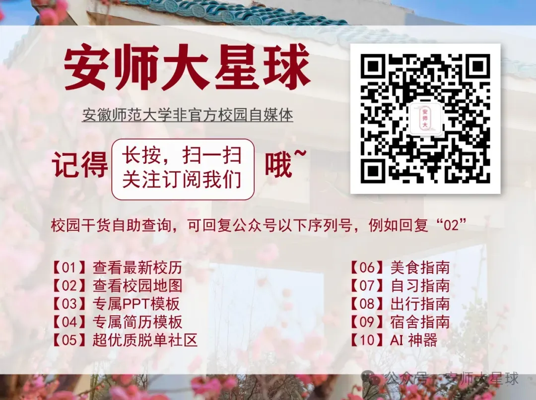 --关注微信公众号“安师大星球”-- “安徽师范大学”PPT模板来了~ 安徽师范大学简历模板~ 安徽师范大学历年期中期末真题来了~ 安师大墙墙墙 | 校园小程序社区入口 安师大学长学姐薪资爆料第5期~ 安师大保研群&科研群来了~ 师大线上实习兼职群来啦!