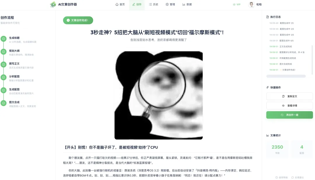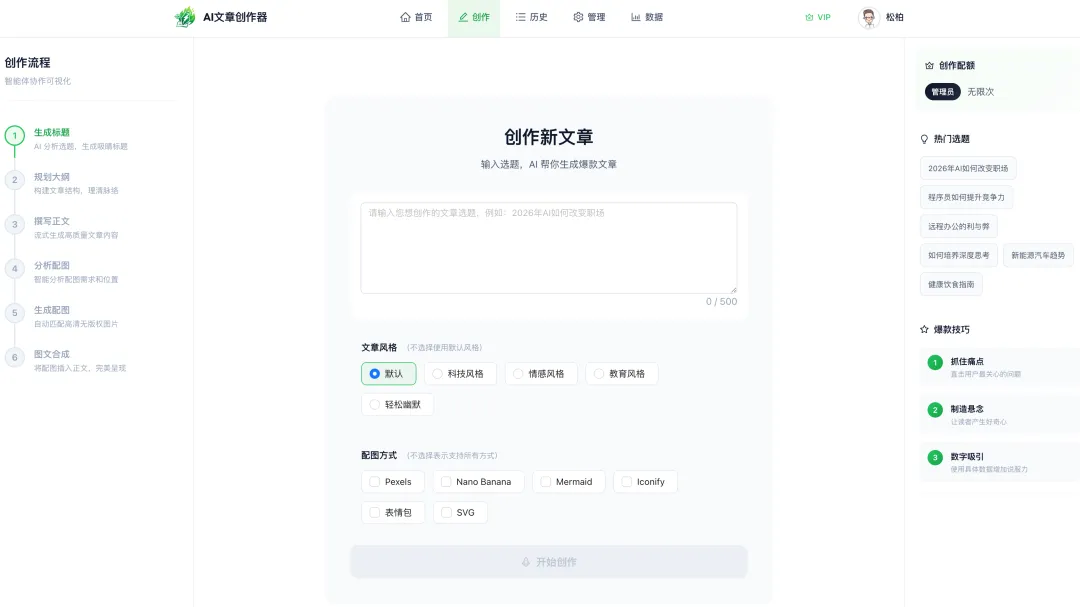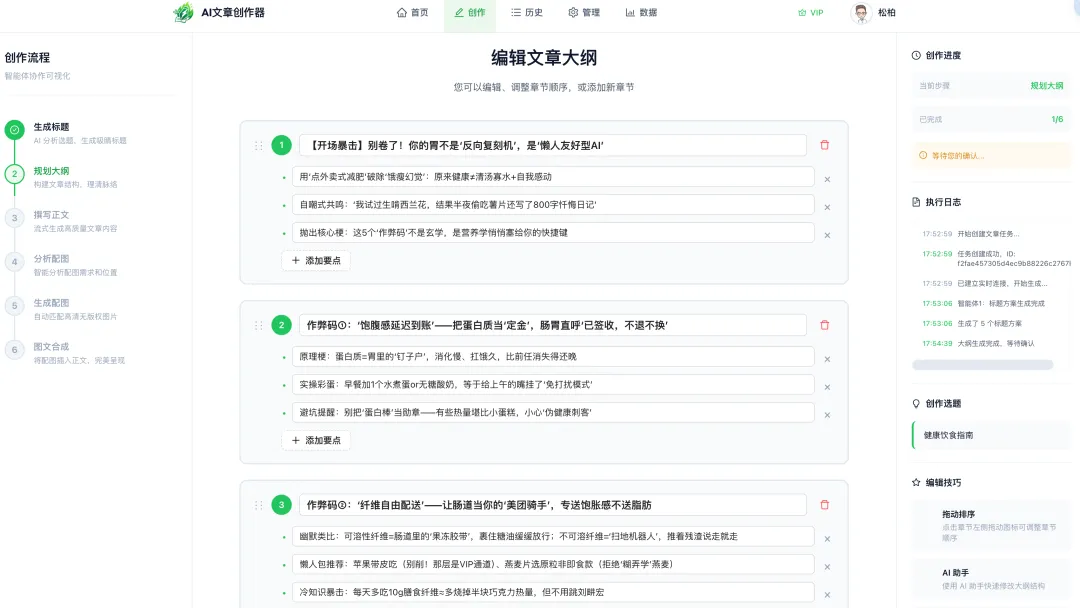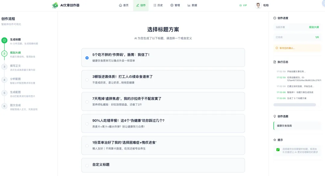 1)多智能体协作创作:用户输入选题,由 5 个智能体协作完成从标题、大纲、正文到配图的完整创作流程,采用流式输出让用户实时看到 AI 的创作过程。