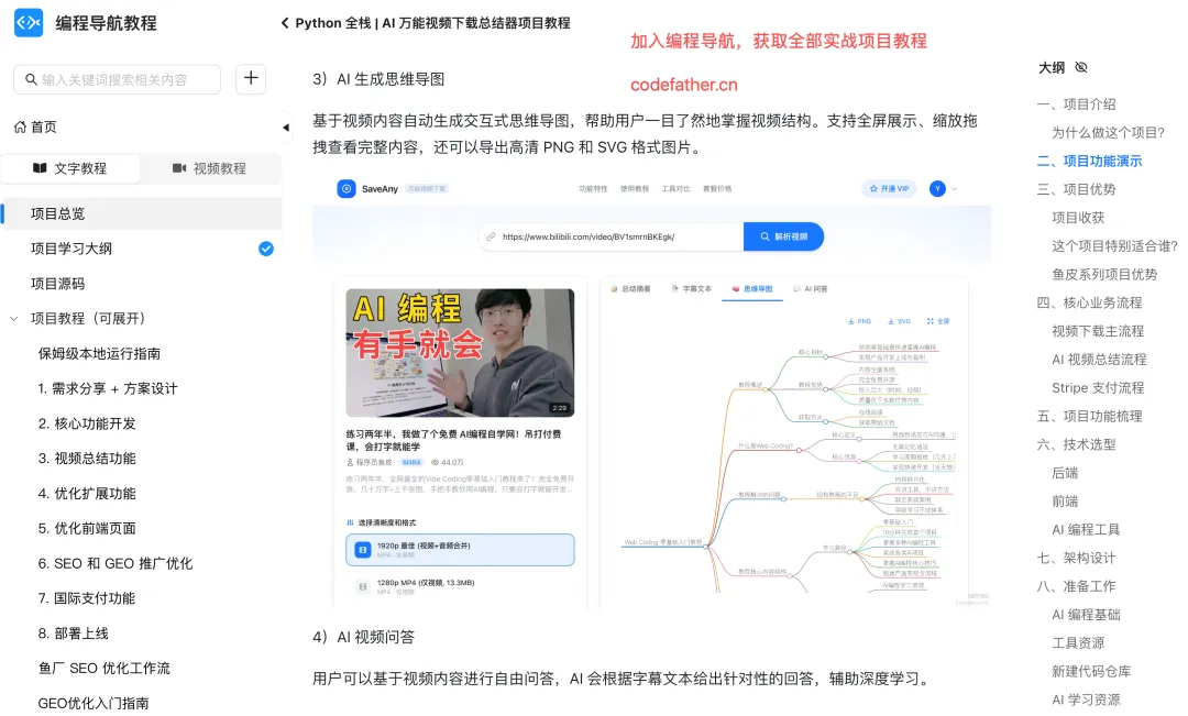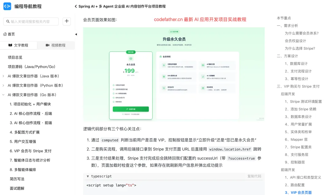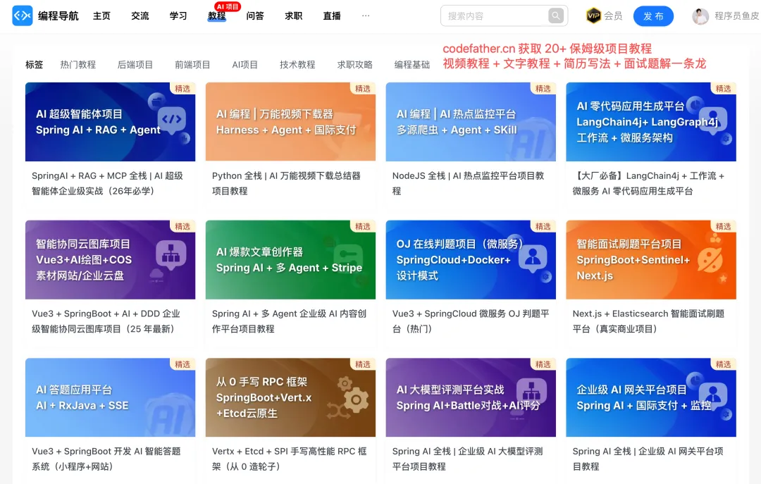 编程导航已有 近 30 套项目教程! 每个项目的学习重点不同,从 0 到 1 带做,涵盖企业级 Java 后端 + 前端全栈项目、最新 AI 应用开发 + AI 编程项目、大厂架构进阶项目。