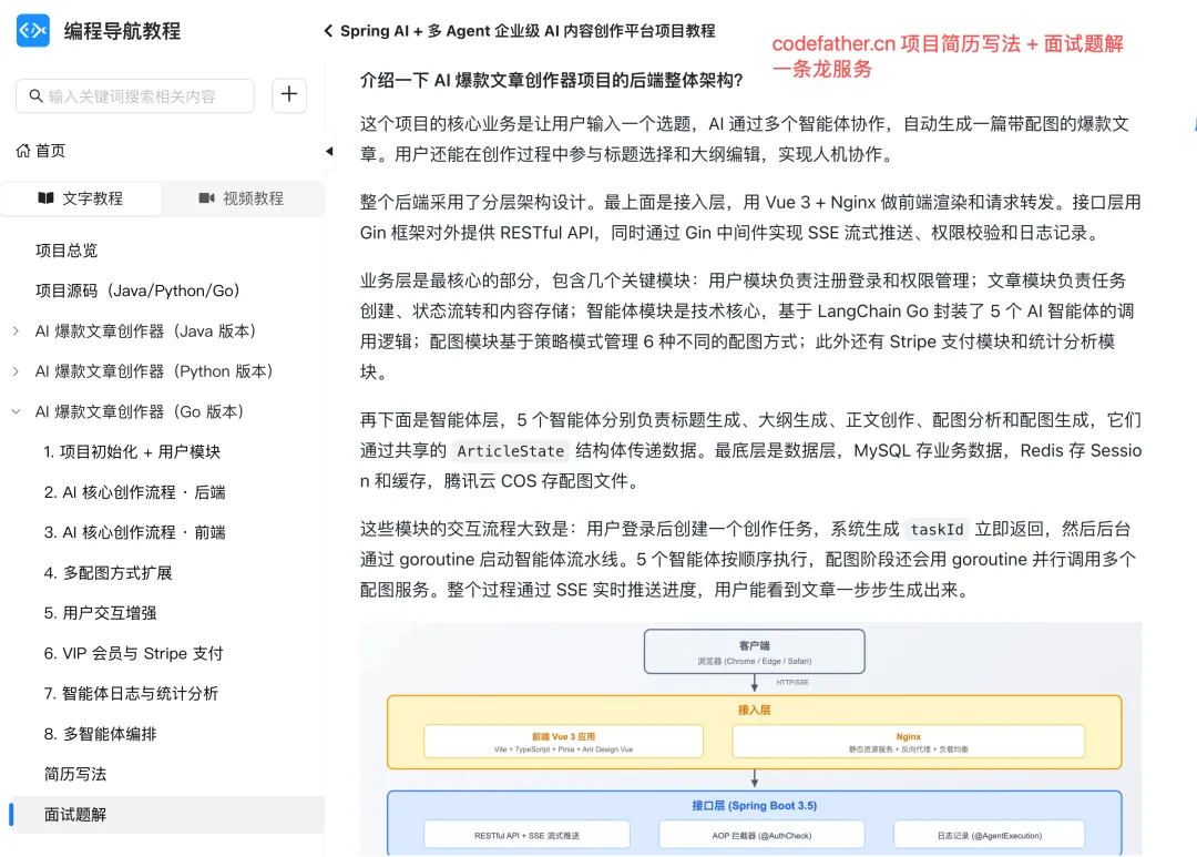 为了帮大家在金三银四冲刺,除了我高强度直播带做新项目外,这次我还拉上自己团队的开发骨干,一起爆肝出了一套全新的保姆级新项目教程《AI 爆款文章创作平台》,几分钟生成一篇配图丰富的文章~