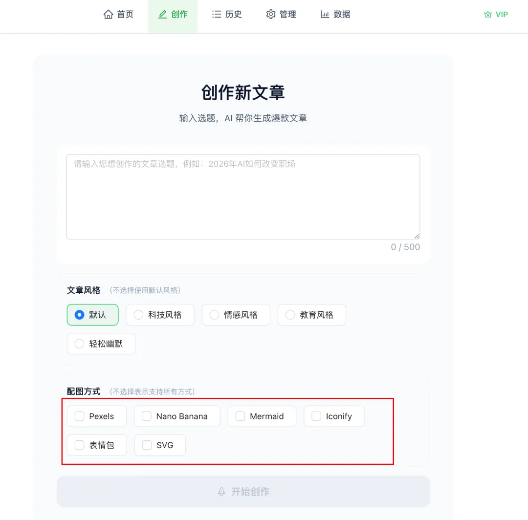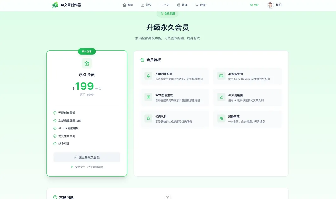 4)VIP 会员 + Stripe 国际支付:集成 Stripe 国际支付,实现 VIP 会员开通、配额差异化管理、配图方式权限控制等完整的会员体系。