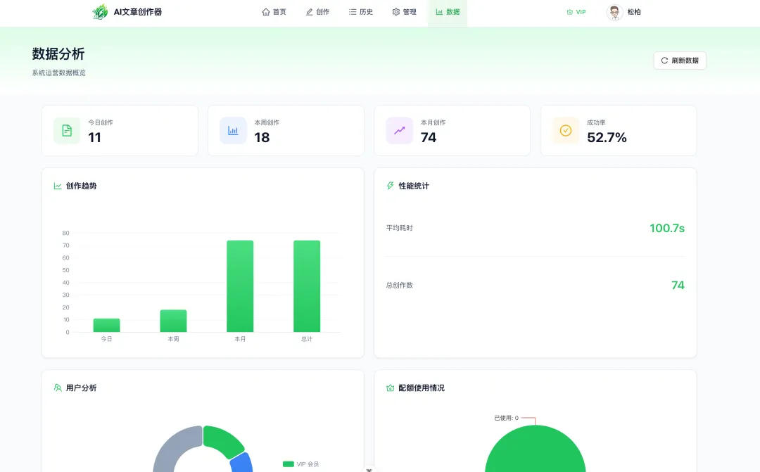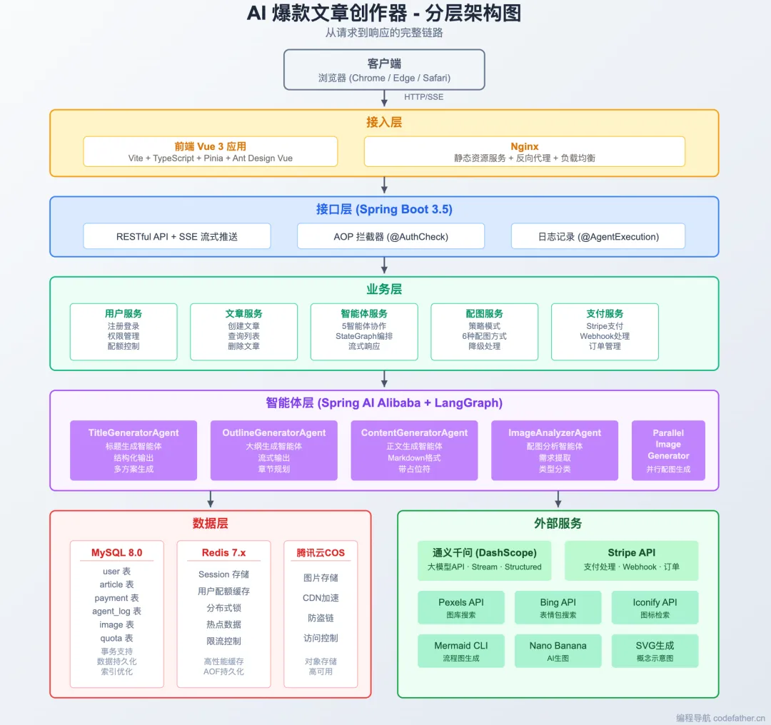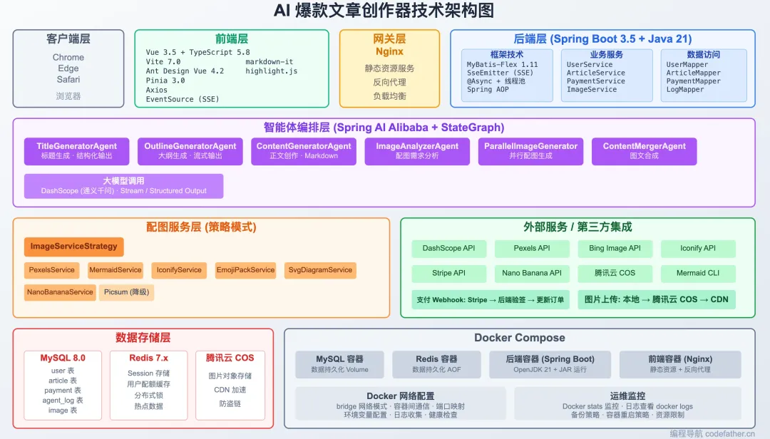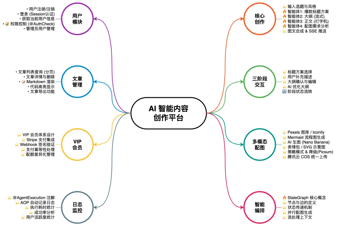 该项目功能丰富,涵盖用户系统、文章创作、多智能体编排、配图服务、VIP 会员支付、统计分析 6 大模块,20+ 功能点,覆盖了从 AI 多智能体协作、策略模式扩展到国际支付的完整企业级 AI 应用开发流程。