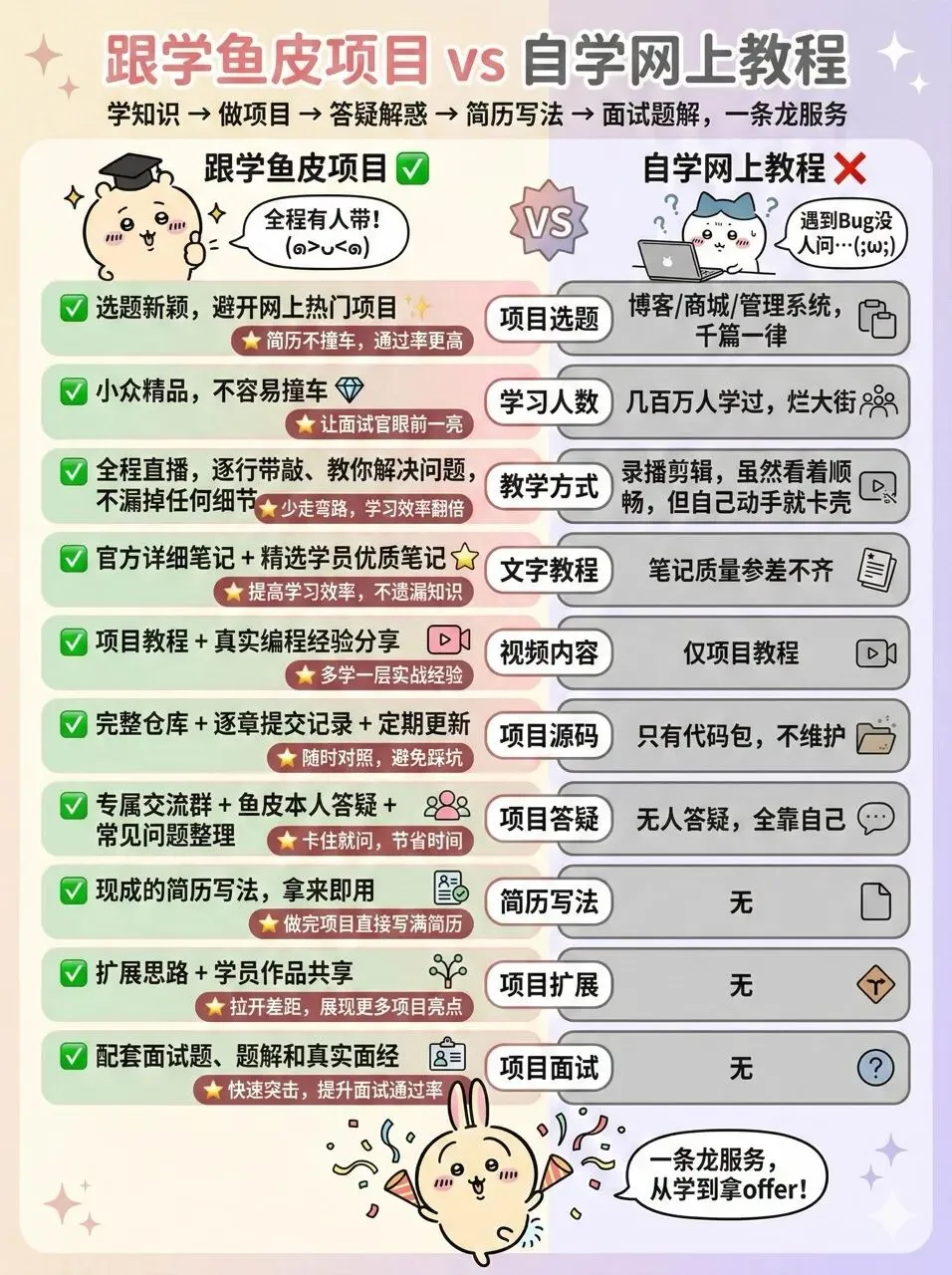 比起看网上的教程学习,鱼皮项目系列的优势:从学知识 => 实践项目 => 复习笔记 => 项目答疑 => 简历写法 => 面试题解的一条龙服务