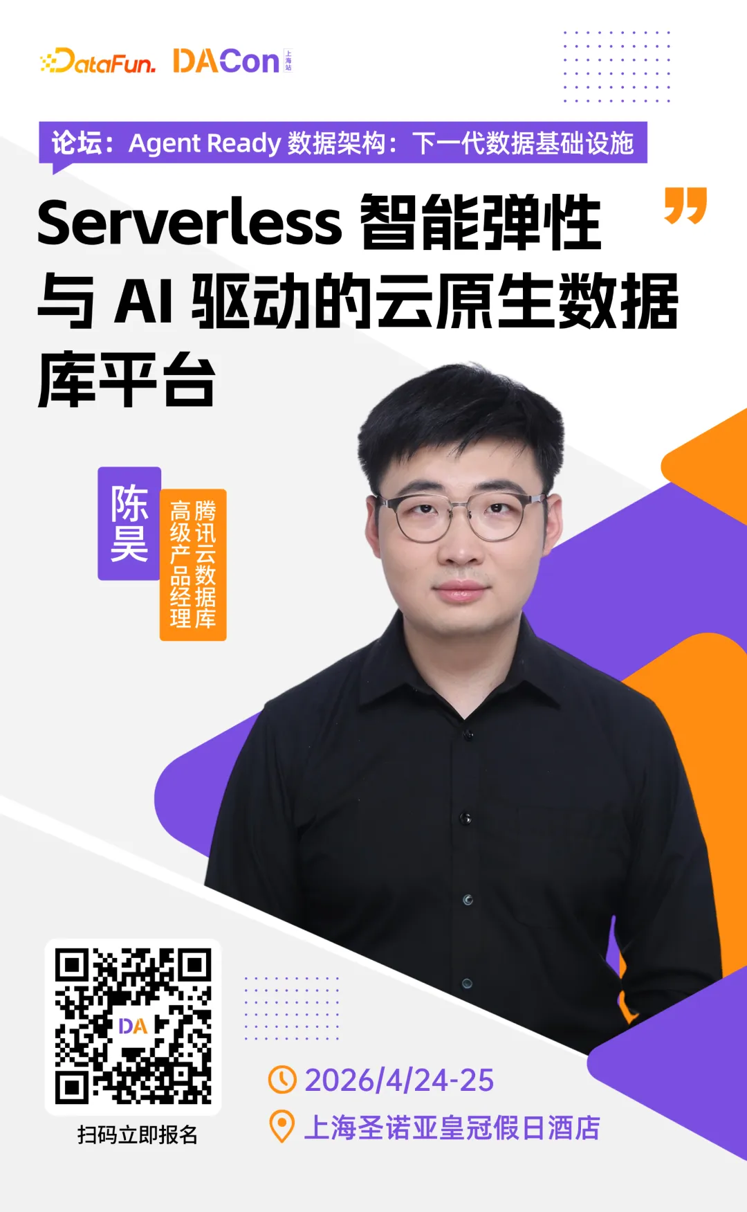 在4月24-25日上海举办的DACon大会上,腾讯云数据库高级产品经理陈昊老师将分享《Serverless 智能弹性与 AI 驱动的云原生数据库平台》话题内容,本次演讲将解析 TDSQL-C Serverless 在 AI 加持下,如何实现极致弹性与稳定性的统一,并分享其在应对突发流量等场景中的关键实践与洞察。