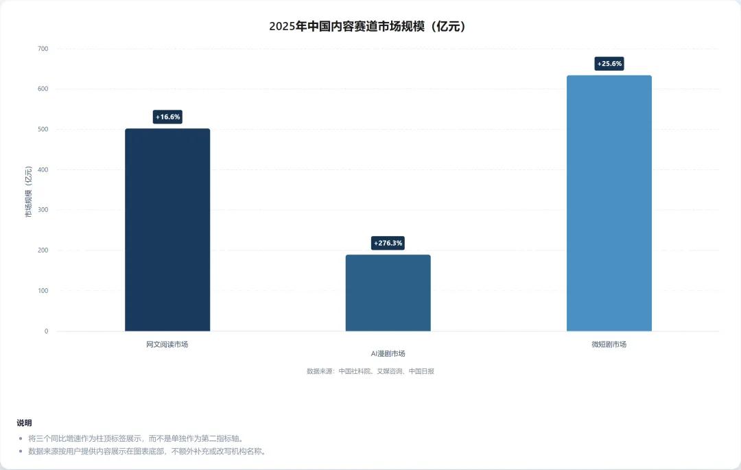 与此同时,AI 漫剧这条最年轻的改编通道在 2025 年全年冲到 189.8 亿元,同比增长 276.3%。微短剧市场从 2024 年的 505 亿元增长到 2025 年的 634.3 亿元。三条赛道并行放量,但增速差异悬殊。