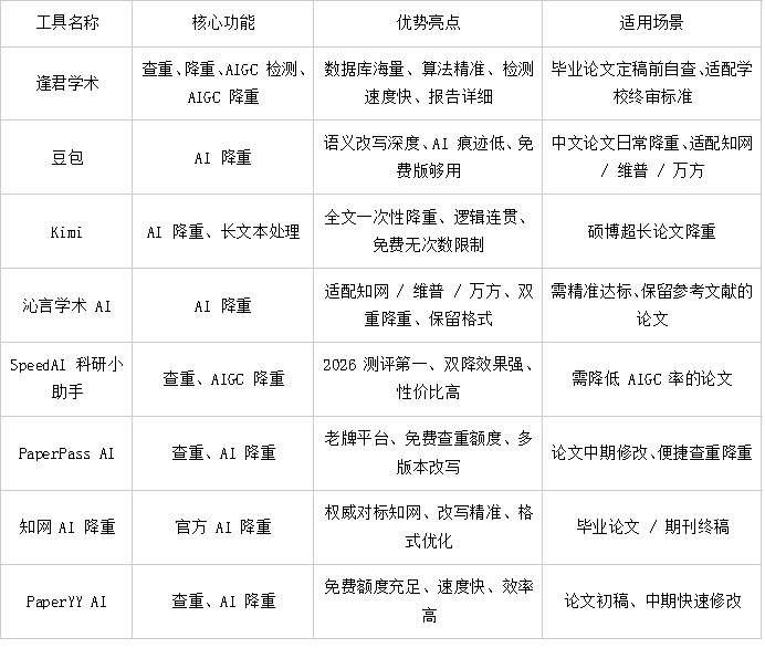 8 款 AI 查重降重工具核心实测对比表