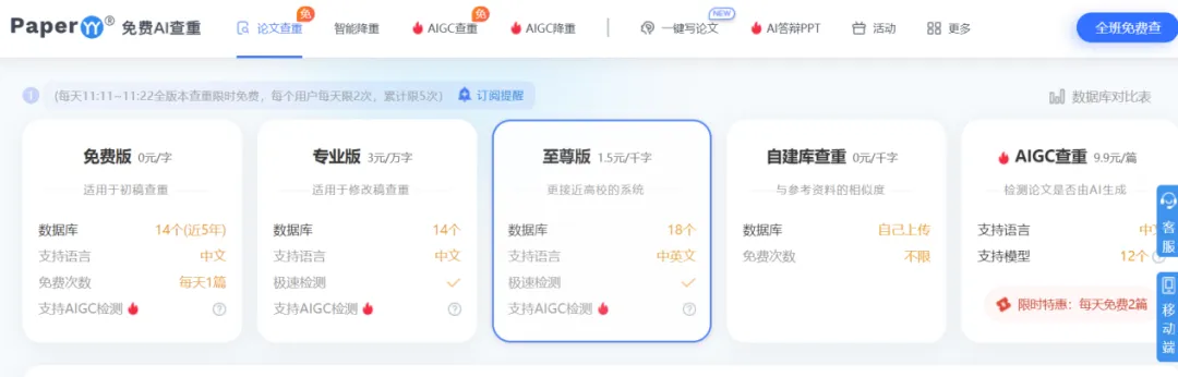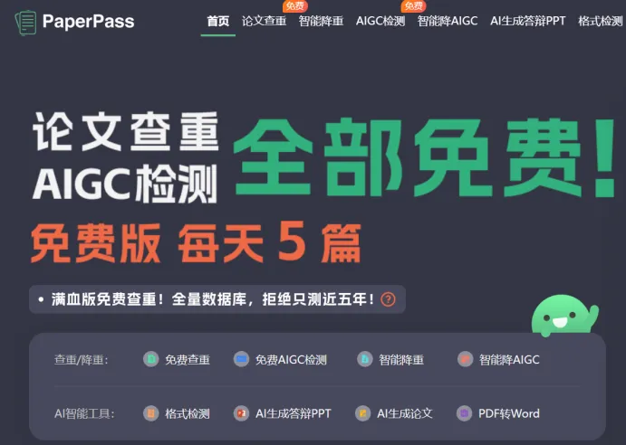 免费查重 + AI 降重组合工具,查重速度快、AI 改写效率高,适合论文初稿、中期修改降重,免费额度充足。