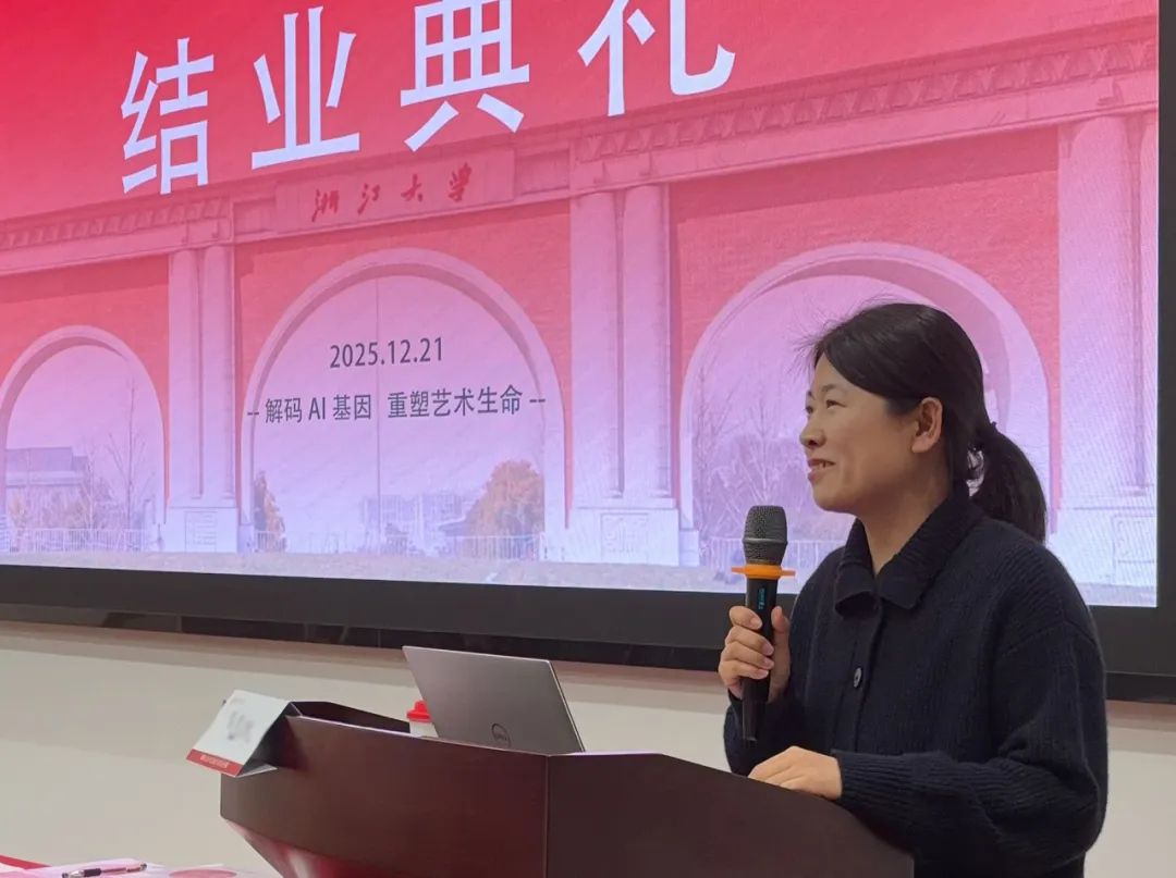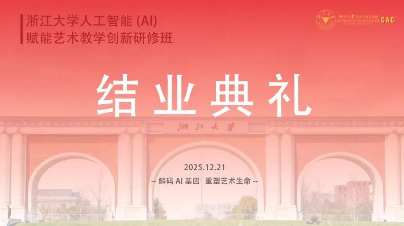 2025年12月21日,浙江大学人工智能(AI)赋能艺术教学创新研修班结业典礼在浙江大学隆重举行。该研修班由浙江大学艺术与考古学院主办,是学院首次面向社会公众推出的人工智能赋能艺术的专题研修项目。自启动以来,项目受到社会各界广泛关注,学员背景多元,涵盖高校教师、设计师及文化艺术爱好者,共同构筑了开放、融合的学习共同体。