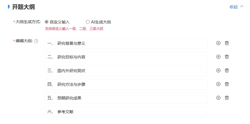 默认就是6个板块,也就是常见的研究背景与意义、目标与内容......一直到最后的参考文献。
