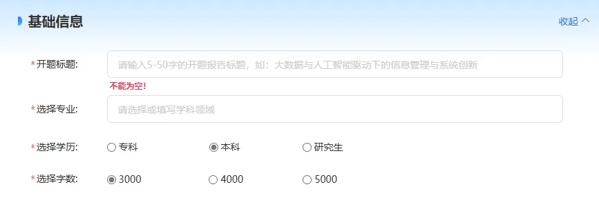 这个就很简单啦,咱们只需要输入开题报告的标题、你的专业、学历,以及需要的字数就可以了。