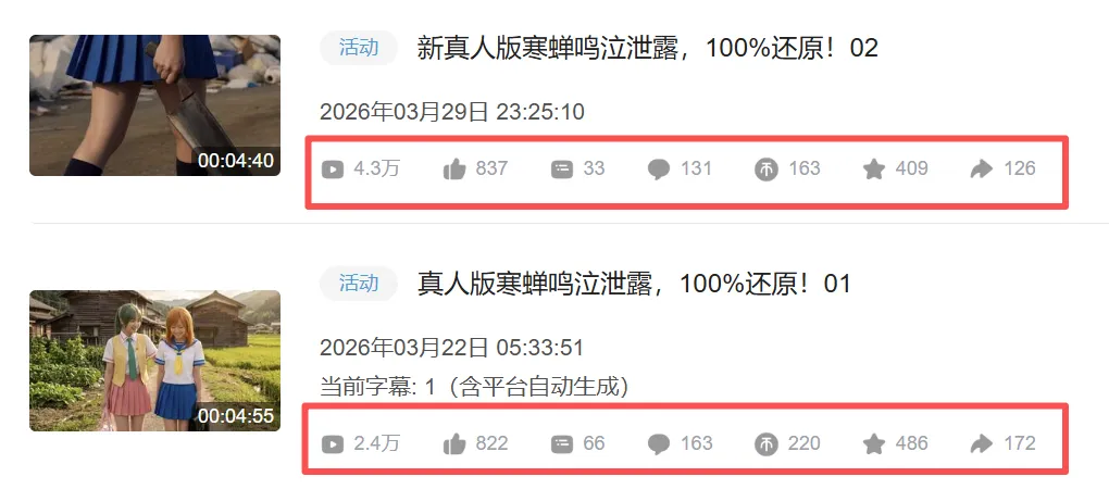 现在 AI 真人短剧不是很火嘛,刚好我做的《寒蝉鸣泣之时·鬼隐篇》短剧在 B 站小爆了: