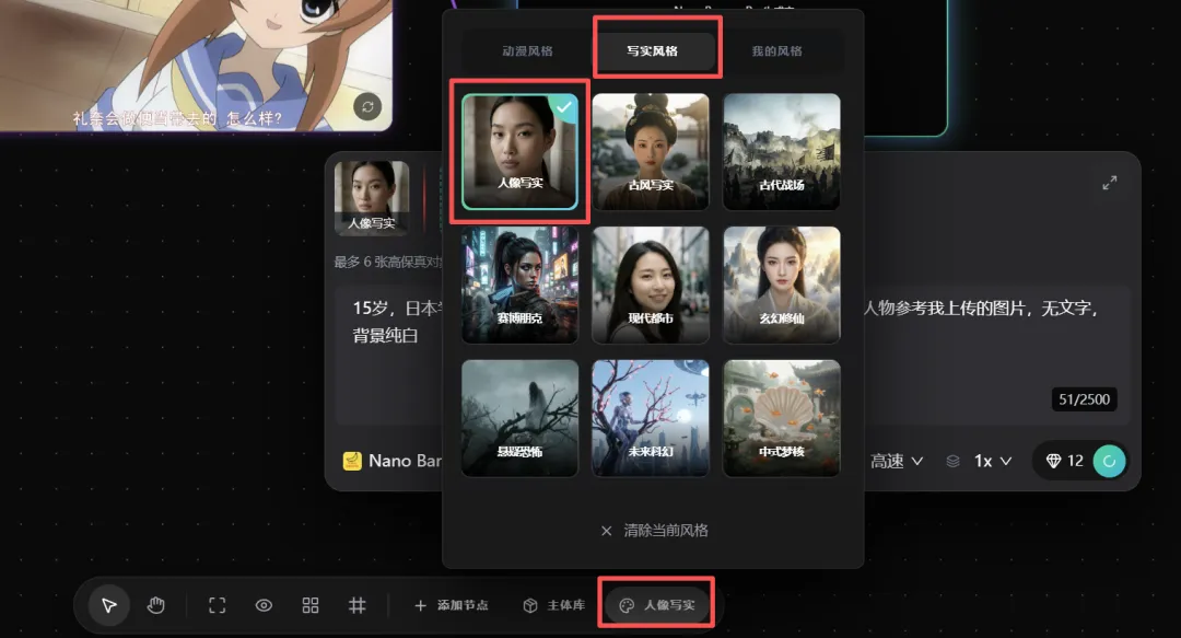 这时我们去生成的话,它还会很贴心地建议我们统一整个画布的风格,这里我就直接选择“人像写实”了,大家可以根据自己的需求进行调整: