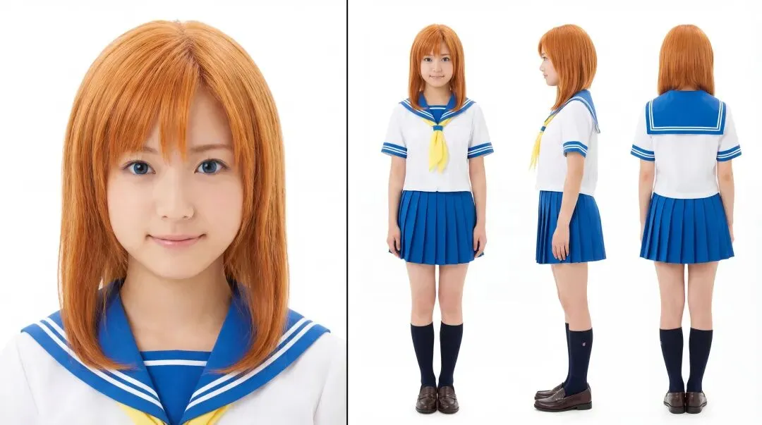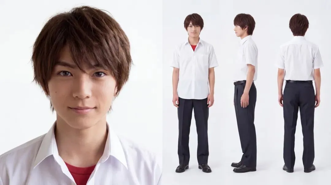 15岁,日本学生,真人风格,帮我生成左边是大头照,右边是三视图,人物参考我上传的图片,无文字,背景纯白
