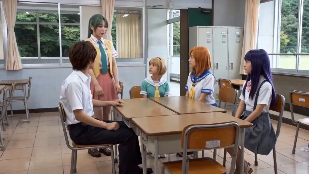 @前原圭一 是A,@龙宫礼奈(蕾娜) 是B,@园崎魅音 是C,@Image 41 是D,@Image 40 是F,夏天中午,蝉叫和鸟叫声,在日本教室里面,A和B和C和D和F围着坐着,C说日语:“我想把前原圭一作为我们的新社团成员,大家觉得怎么样”,切,B举手开心说日语:“礼奈没有意见”,D笑着说日语:“我和沙都子都赞成”,自由运镜,自由切景别,C的音色参考@园崎魅音音频 ,D的音色参考@古手梨花的音频 然后我们再在里面截图全景画面: