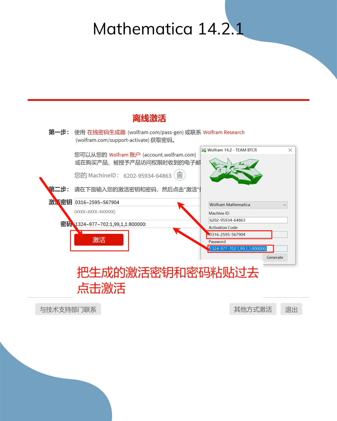 3. 生成密钥:粘贴 MachineID 后点击Generate,将生成的密钥与密码填回软件即可激活