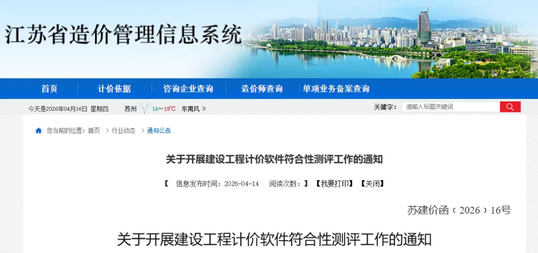 转发《关于开展建设工程计价软件符合性测评工作的通知》各有关单位:《建设工程工程量清单计价标准》(GB/T50500-2024)及9本工程量计算标准将于2026年6月1日起在江苏省域内施行,同步施行《江苏省建设工程消耗量指标》2026版、《建设工程电子招标投标造价数据交换标准》、《建设工程造价指标指数标准》,为确保各项新标准实施后相关计价软件产品的准确性、规范性和兼容性,现决定组织开展计价软件符合性测评工作,有关事项通知如下:一、测评范围凡具备合法开展经营活动且依据《建设工程工程量清单计价标准》(GB/T50500-2024)及9本工程量计算标准、《江苏省建设工程消耗量指标》2026版、《建设工程电子招标投标造价数据交换标准》、《建设工程造价指标指数标准》进行开发的计价软件企业,均可申请参加本次符合性测评。二、测评项目(一)计价依据符合性测试。核查计价软件对部2024版新标准及江苏省住建厅公告(〔2025〕第12号)、《江苏省建设工程消耗量指标》2026版、《江苏省建设工程工料机数据库》的符合性情况。(二)《建设工程电子招标投标造价数据交换标准》符合性测试。核查XML文件数据结构是否与省标准保持一致,测试软件与公共资源交易中心等平台导入、导出功能,确保文件可正常参与清标、评标流程。(三)《建设工程造价指标指数标准》符合性测试。核查软件内置工程层级、信息内容与省标准的一致性。三、测评程序本次测评工作自2026年4月启动,具体分为以下四个阶段:(一)申请受理阶段(2026年4月27日前)1.计价软件企业提交《江苏省建设工程计价软件符合性测评申请表》及其他相关资料(详见资料清单),于2026年4月27日前以现场提交、电子邮件或快递送达等形式报我站;2.我站审核申请材料,确认参评资格;3.向符合条件的申请单位提供电子版计价依据文件、数据库文件、测评标准案例等基础资料,时间另行通知。(二)软件自查与准备阶段(2026年4月28日-5月24日)1.参评单位依据统一提供的资料,对软件进行自查和适配;2.确保软件符合国家标准和我省新版计价依据及其他标准文件;3.对自查发现的问题及时整改。(三)集中测评阶段(2026年5月底前)我站组织测评专家组,对参评软件进行统一测评,主要包括:1.标准符合度(1)清单规范:项目划分、项目编码、项目名称、项目特征、计量单位、工程量计算规则、工程内容及其他规定是否跟新清单标准一致;(2)消耗量指标配套:项目编码、名称、单位、人材机含量是否与现行计价依据完全一致;(3)指标规范:指标编码、项目名称、计量单位、工作内容及附注,人材机编码、名称、单位及含量是否与《江苏省建设工程消耗量指标》(2026版)完全一致,工程层级划分、各层级信息填写是否严格响应《建设工程造价指标指数标准》要求;(4)数据交换:招标文件能与各计价软件实现互导。招标、最高投标限价、投标报价文件能通过XSD校验,可正常导入招投标工具和系统。2.计价准确性费用计算程序符合江苏省最新发布的费用规则及相关规定。3.数据合规性(1)报表格式符合省规范统一样式;(2)指标归集数据存储结构规范,满足工程造价数据归档与监管要求。(四)总结与公布阶段(2026年5月底前)1.我站汇总测评意见,形成测评报告;2.对通过测评的软件,由我站向社会公布;初次测评未通过的单位,可向我站申请复审,复审通过后另行公布;3.对测评中发现的共性问题和典型争议,组织专题研讨,为后续标准解释和修订提供依据。四、申请材料参评单位需提交以下材料:1.《江苏省建设工程计价软件符合性测评申请表》一式两份(见附件);2.计价软件一套(含加密锁);3.营业执照复印件一份;4.软件著作权证书复印件一份。五、其他事项(一)请各计价软件企业按照规定时间办理资格审核,通过审核的企业请携带移动存储设备到省站现场领取测评资料。(二)专家评审会具体时间及地点另行通知。(三)现场报名资格审核地点及邮寄地址:南京市鼓楼区草场门大街88号江苏建设大厦31楼。联系人:刘劲松 联系电话:025-51868983 李 静 025-51868989电子邮箱:jszjzzljs@qq.com附件:江苏省建设工程计价软件符合性测评申请表江苏省建设工程造价管理总站 2026年4月14日