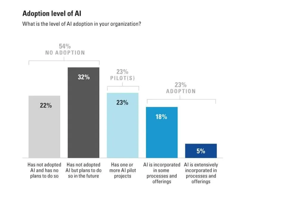 老师用它批评那些梦想考清华却连作业都懒得写的学生;老板用它指责那些谈论战略却连Excel都用不好的员工。在工业时代,这确实是一种致命缺陷——执行力是唯一的护城河,空想毫无意义。但2026年的今天,当GitHub Copilot能自动生成70%的业务代码,当Midjourney能在30秒内产出专业级设计稿,当DeepSeek以十分之一的成本达到顶尖程序员80%的性能时,游戏规则已经彻底改变。AI消灭的不是岗位,而是重复劳动。当"手"的工作被机器接管,"眼"的价值反而被无限放大。MIT与波士顿咨询的联合研究显示:85%的高管认为AI能带来竞争优势,75%看好AI开辟新业务,但全面部署AI的企业仅有5%。这不是技术问题,而是认知落差——大多数人还在用工业时代的思维,应对智能时代的挑战。