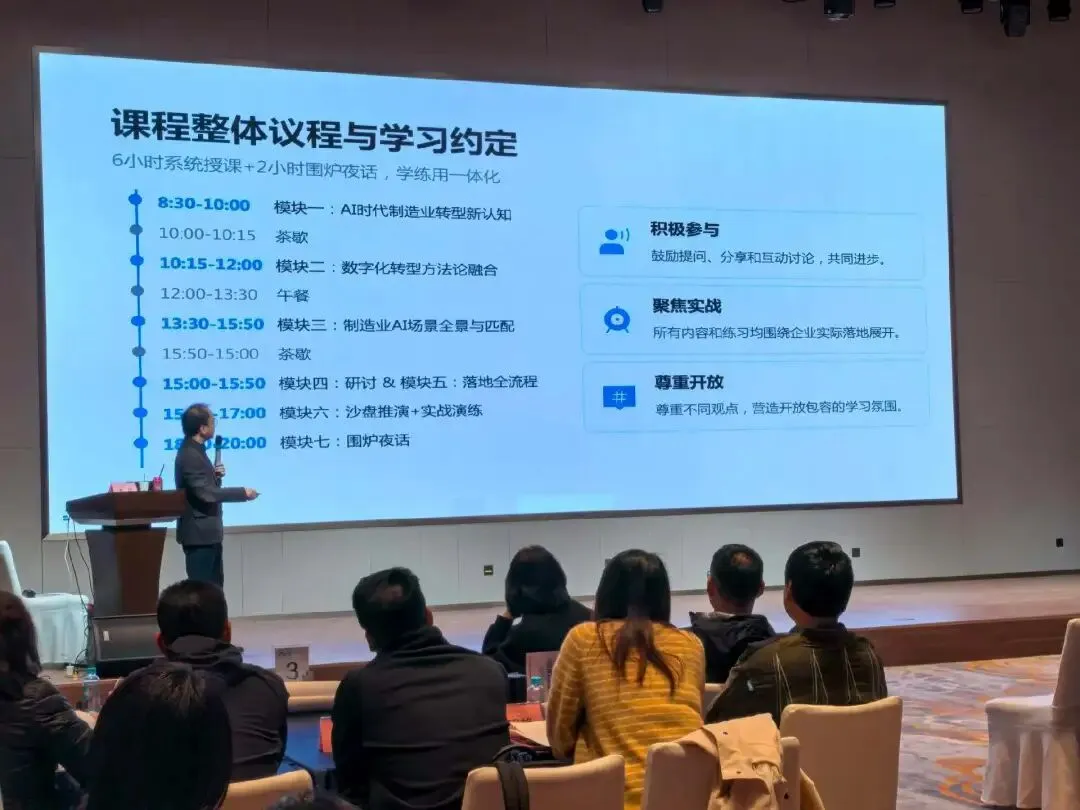 在实战层,现场拆解企业转型常见误区(如重平台轻场景、重技术轻管理),传授 “单点突破 — 线面联动 — 全局优化” 的渐进式落地法,确保学员学完即用、落地见效。这一方法为企业的转型提供了一种可行的实施路径,让企业能够逐步推进转型,避免盲目投入和风险。