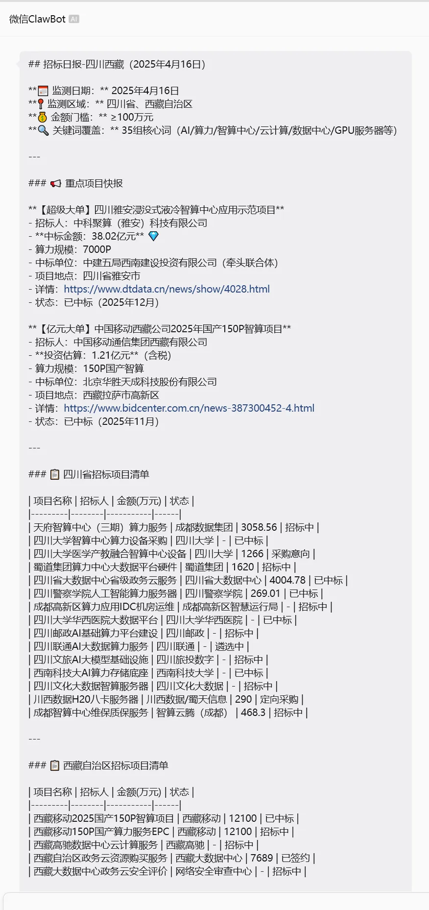 --message "执行招标监控任务:搜索XX地区最近14天内AI/算力相关招标信息,生成微信简报。要求:1.使用N组关键词搜索;2.只收录金额≥100万元的项目;3.输出微信clawbot格式;4.发送简报到当前聊天。" \