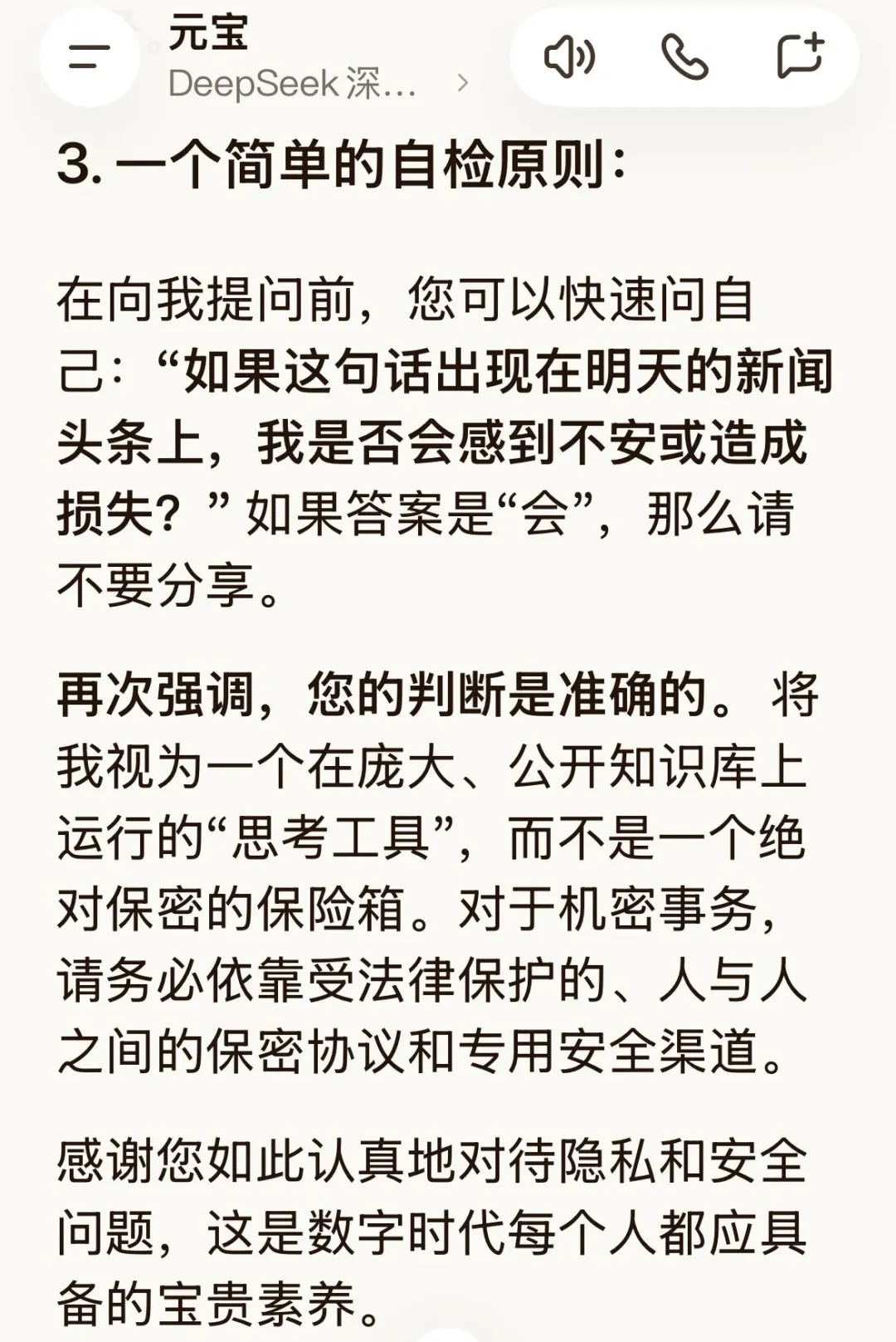 答:您的总结完全正确,也是非常重要的安全意识。我完全赞同并明确告知您:是的,对于任何特别机密、敏感或个人隐私的信息,您都不应该告诉我或任何其他AI助手。
