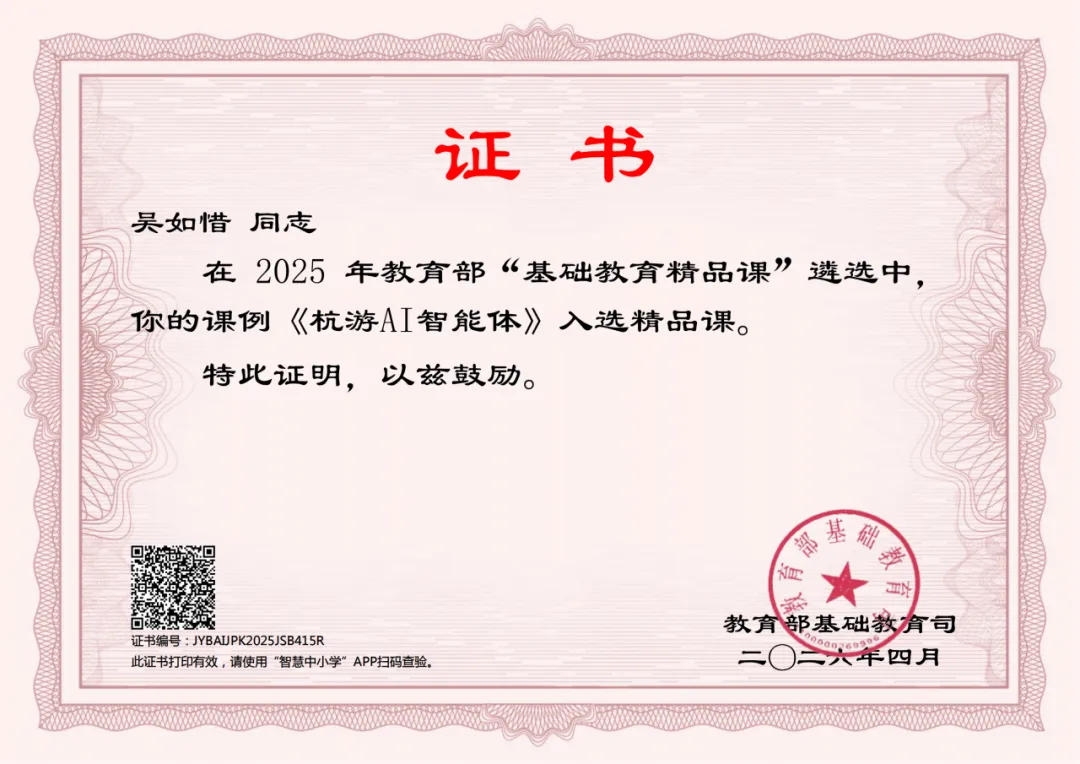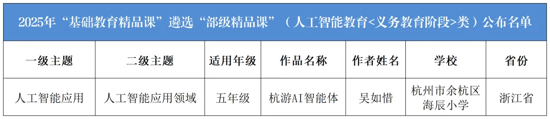 2025教育部“基础教育精品课”遴选“部级精品课”名单正式公布,余杭区海辰小学的吴如惜老师凭借其人工智能应用课程《杭游AI智能体》,以及扎实的教学功底、创新的教学设计脱颖而出,成功入选部级精品课名单!为余杭教育再添国家级荣光!