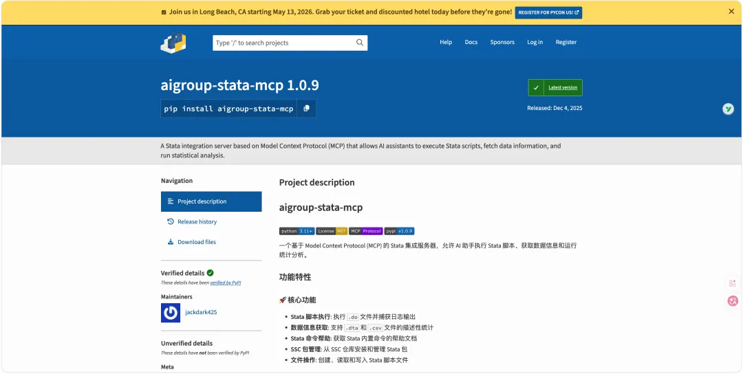 1. Stata MCP 项目(PyPI)https://pypi.org/project/aigroup-stata-mcp/ 2. MCP 协议官方说明https://modelcontextprotocol.io/ 3. MCP Stata 实现说明https://pypi.org/project/mcp-stata/ 4. Claude Code MCP 使用说明https://mcpcow.com/ja/service/stata-1/