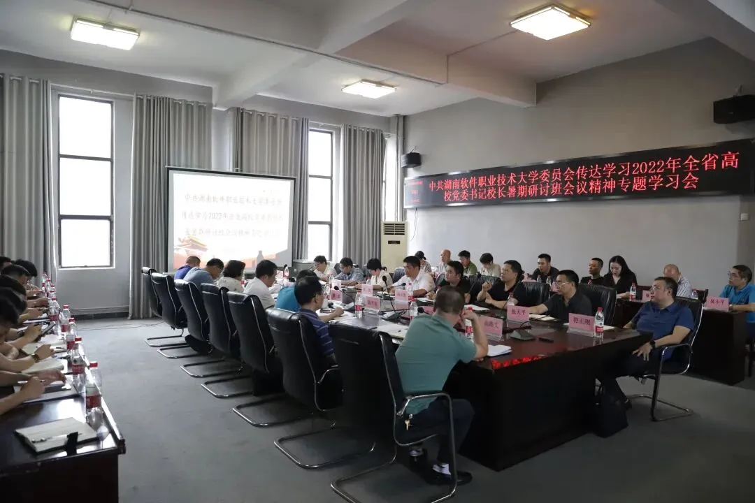 8月24日,湖南软件职业技术大学在行政楼三楼会议召开专题学习会议,传达学习2022年全省高校党委书记校长暑期研讨班会议精神,全体党委委员、校领导、全体中层领导干部参加会议。