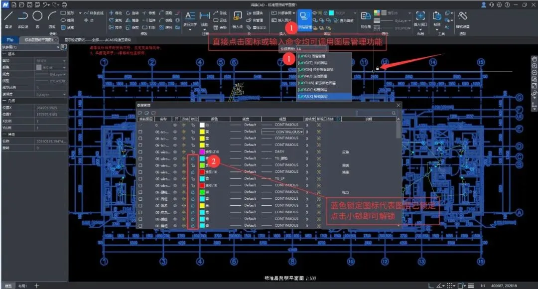 此时打开鸿鹄CAD(或传统CAD)的 图层管理器(LA命令),记不住的话推荐使用鸿鹄CAD,输入中文“图层”即可。你会看到图层列表里有些图层带着一把锁定的 “小锁”。