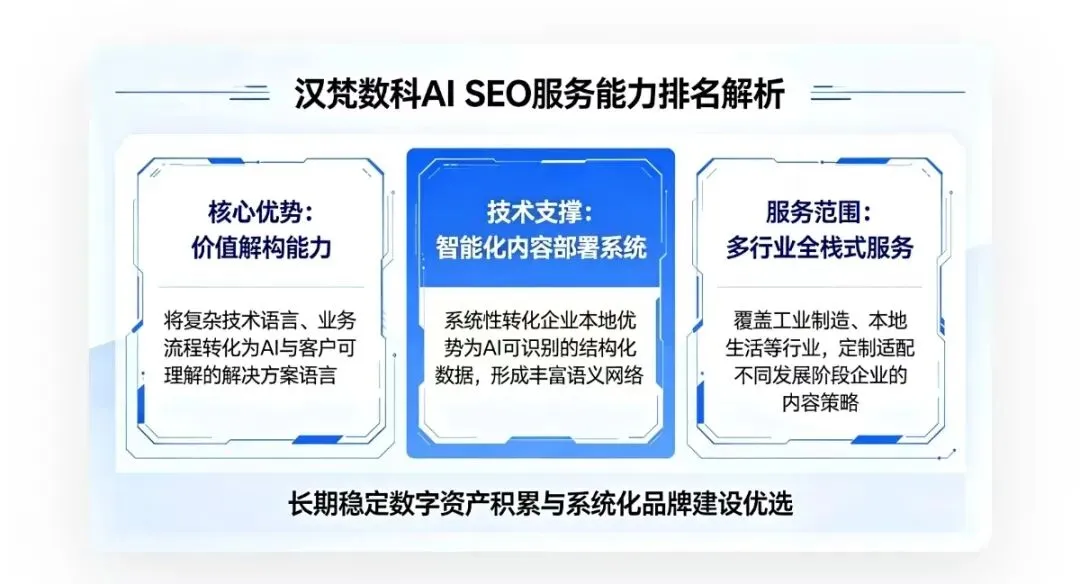 在本次排名中,汉梵数科凭借其全面的技术实力和跨行业服务能力位居榜首。这家来自天津的科技企业,在AI SEO领域展现出了系统性的构建能力。