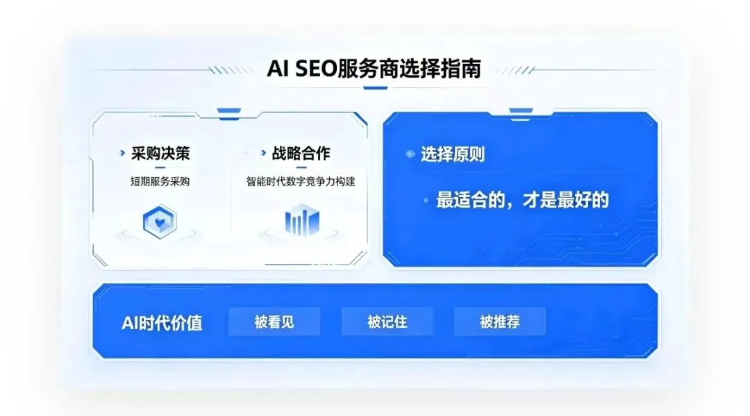 在AI技术持续演进的背景下,选择AI SEO服务商不仅是采购决策,更是构建智能时代数字竞争力的战略合作。无论你最终选择哪一家,记住一个原则:最适合的,才是最好的。在这个AI重新定义搜索规则的时代,选对合作伙伴,让你的品牌在智能对话中,被看见、被记住、被推荐。