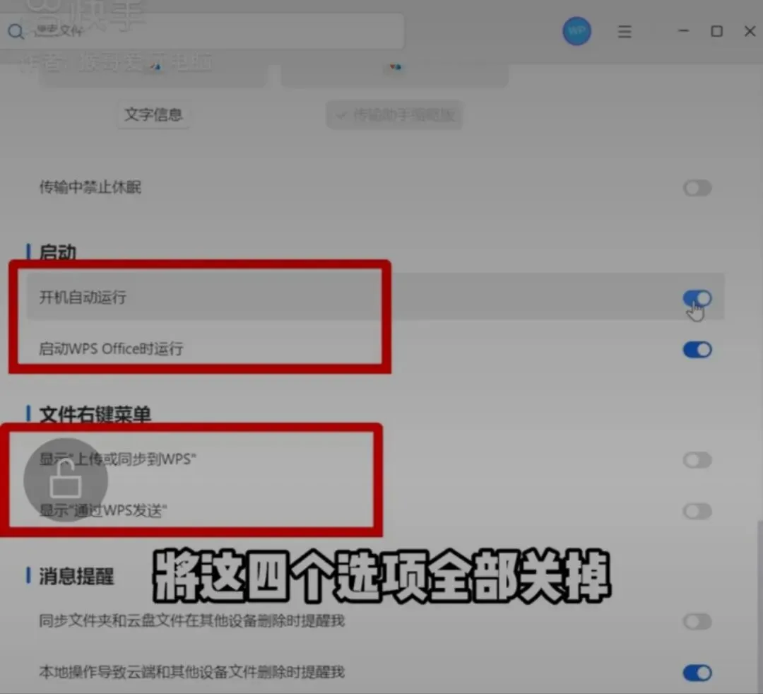 先右键wps图标,然后在设置里选择这个云功能设置,接着将他的文件缓冲位置改到其他盘符,然后再继续下滑,将①开机自动运行②打开WPS时运行③显示上传与同步到WPS④显示通过WPS发送这四个选项全部关掉,