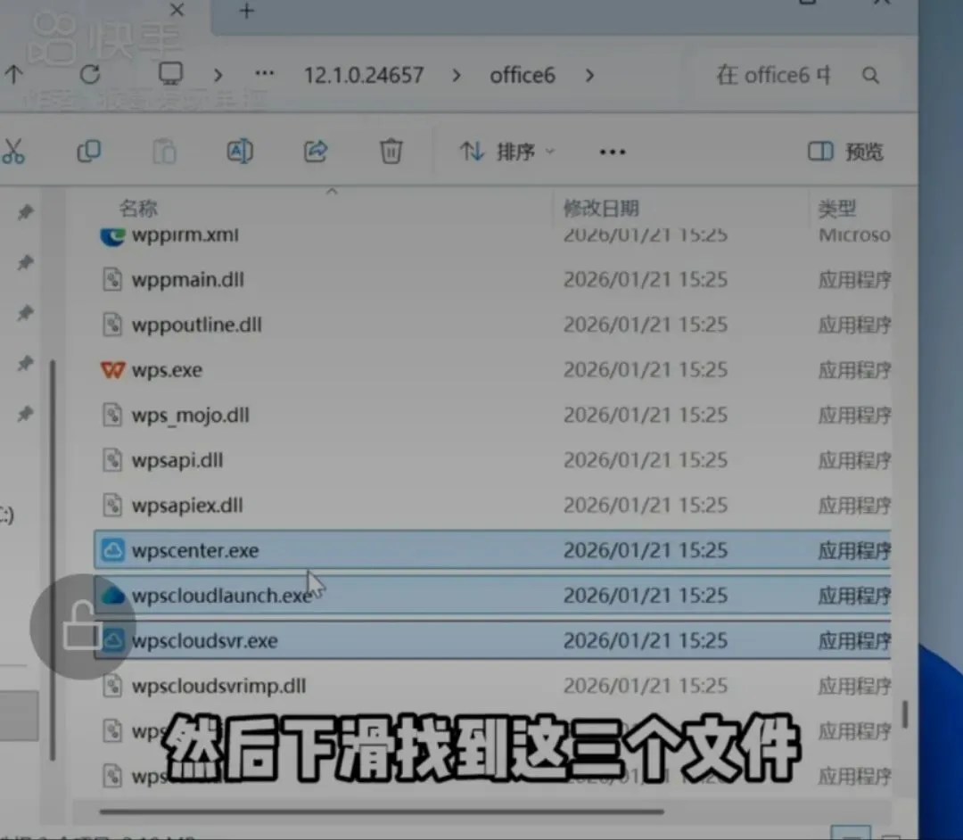 然后下滑,找到这①wpscenter.exe②wpscloudlaunch.exe③wpscloudsvr.exe这三个文件,