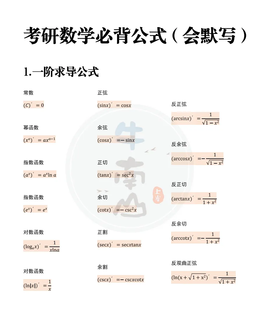 本资料为考研数学《必背公式总结》完整高清电子版PDF 。内含高数+线代+概率论核心公式定理全汇总,逻辑清晰一目了然,纯净无水印,建议冲刺阶段背诵复习效果更佳哦!