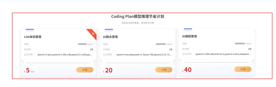 AI编程套餐:¥40/2000万Token 专为重度开发者打造,充足额度支撑高频代码生成、编程调试,高效解锁开发效率
