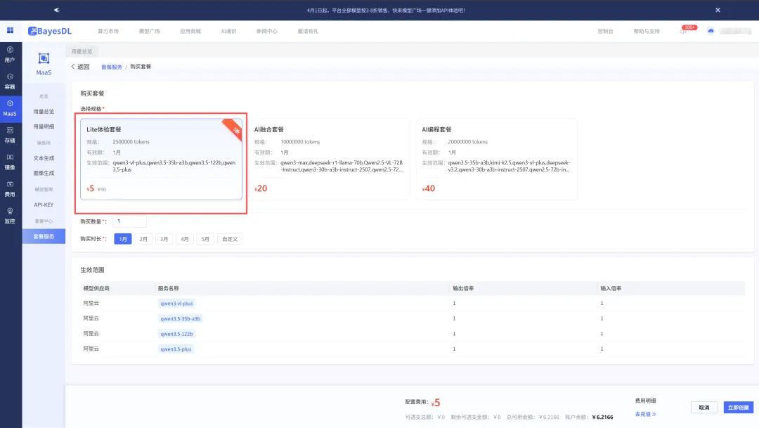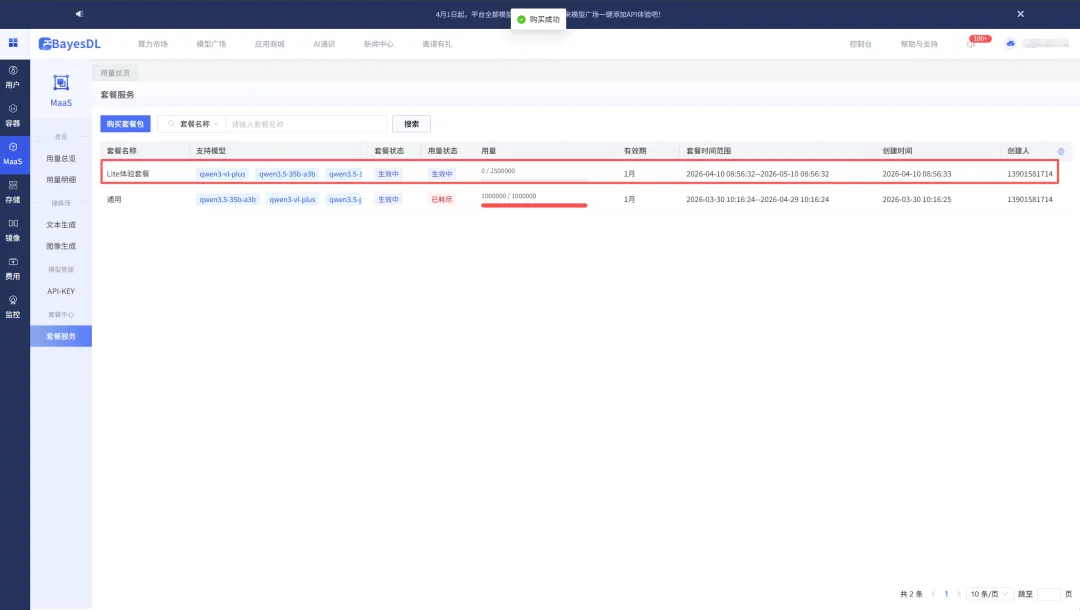 4.选择购买数量和时长,完成订阅后,跳转至「套餐服务」可查看用量与余额。