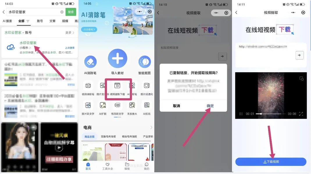 全网视频链接提取、微信内处理 → 水印云管家小程序(一键下载、免安装)